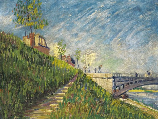 Van Gogh painted Moored Boats at Asnières in the north-west outskirts of Paris. His view is from just beyond the railway bridge, on the north bank of the Seine, facing east. The tall trees at the far right of the composition are on the tip of the Ile de la Grande Jatte. Although Van Gogh’s scene looks bucolic, both sides of the river were then being built up with housing and industry at the time.