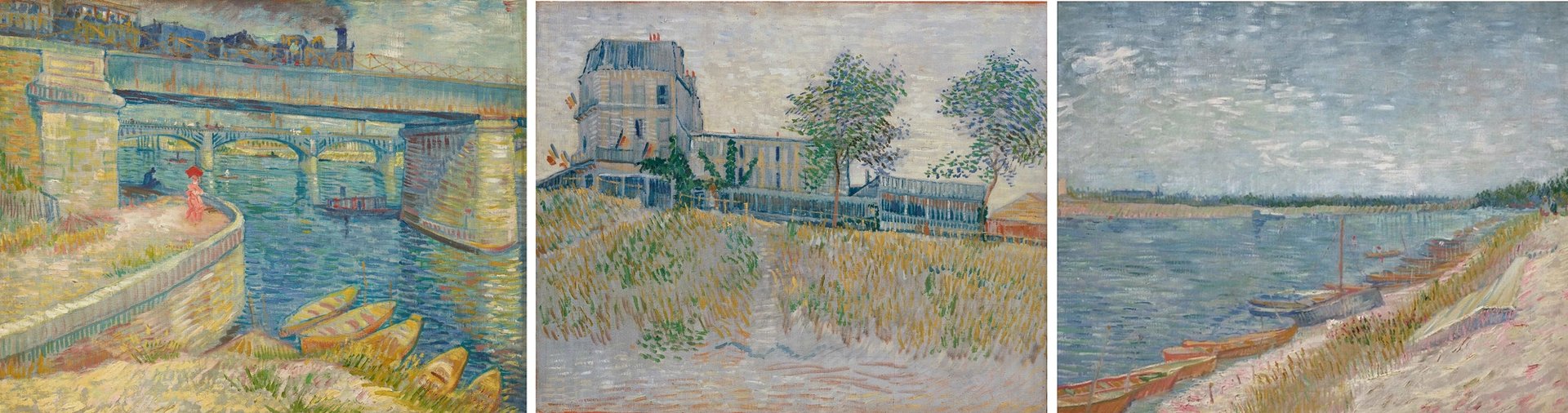 Van Gogh’s triptych of Bridges at Asnières; Restaurant de la Sirène, Asnières; and Moored Boats (all summer 1887)