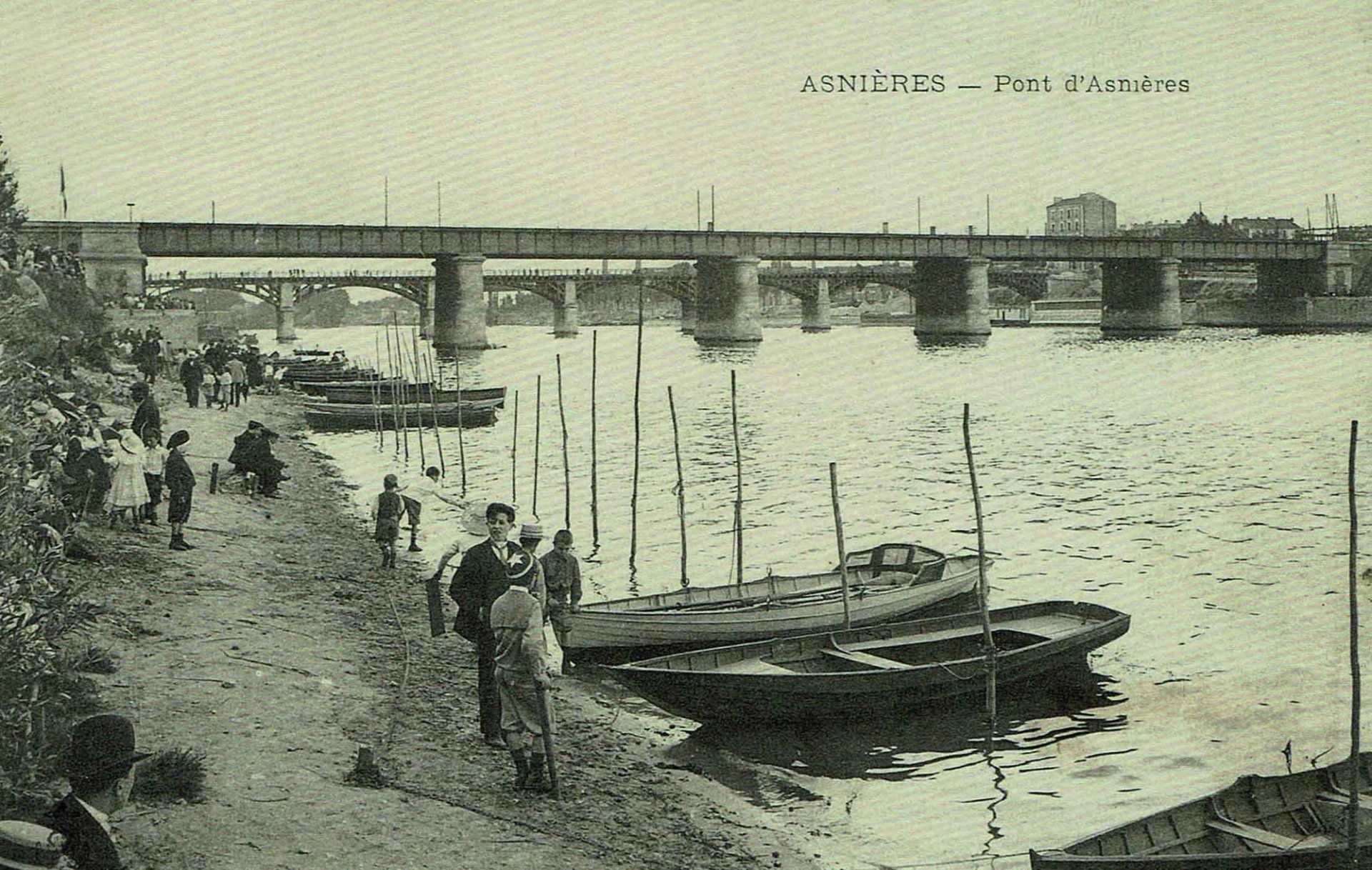 Postcard of the railway bridge at Asnières, around 1900 (Van Gogh painted Moored Boats from near where the two men are standing in the foreground)