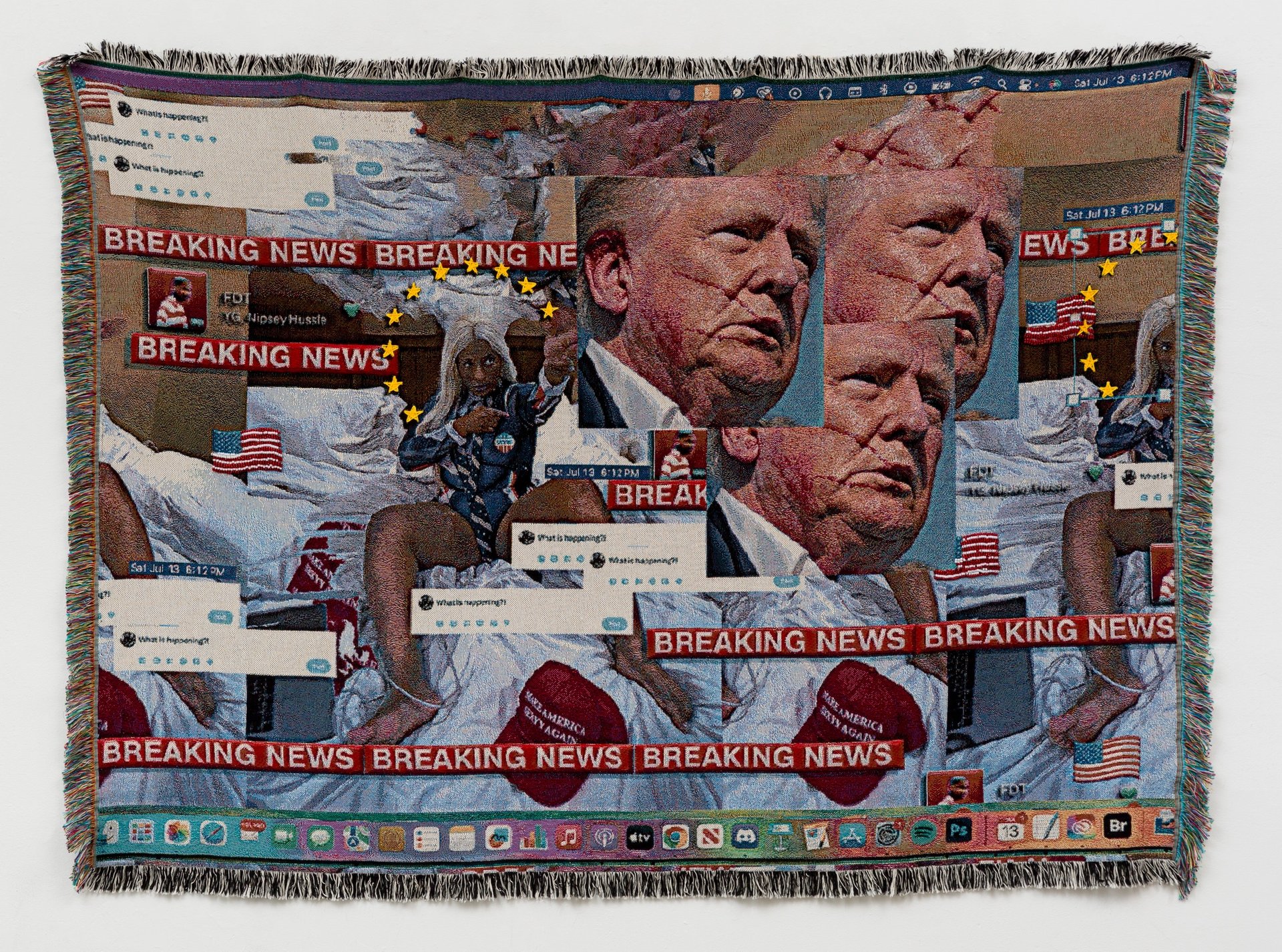 While the upcoming US presidential election may be on people’s minds, very few works at The Armory Show actually referenced it. One was a woven work by Qualeasha Wood titled This is America, Season 248, Episode 45 (2024) at Pippy Houldsworth Gallery’s stand. Conceived after the attempted assassination of former president Donald Trump in July, the tapestry combines a photograph from the event with imagery from social media, television news stations and a self-portrait of Wood mocking “Black Republican women such as Candace Owens who subscribe to the glorification of the American Dream”, according to a description of the work from the gallery. A spokesperson for the gallery said Thursday that the piece had not sold yet, though it did sell a painting by Angela Heisch for $75,000 and a work by Zoë Buckman for $50,000.