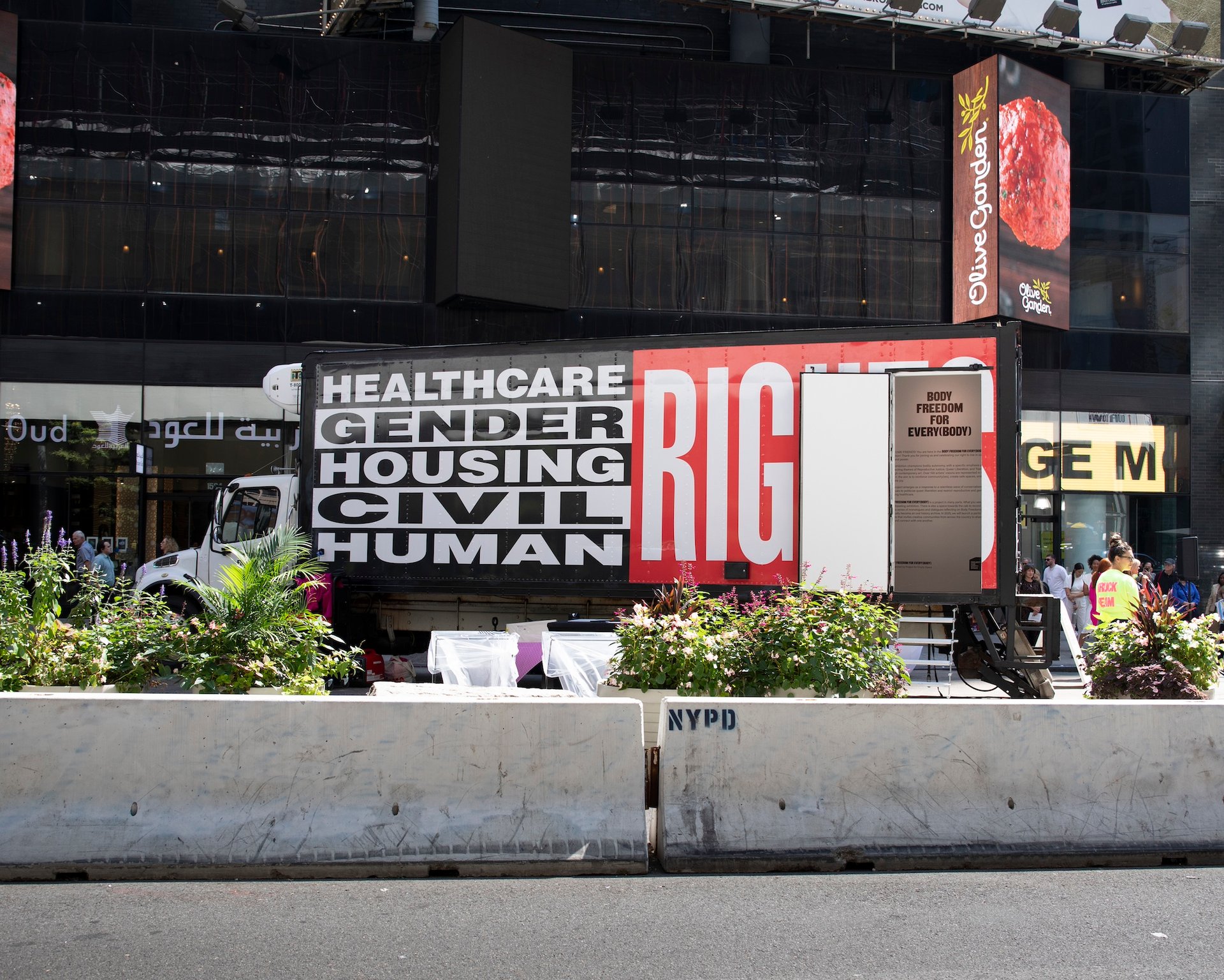 A little more than two years after the US Supreme Court overturned the federal right to abortion, as Republican lawmakers in states across the country enact increasingly draconian restrictions on reproductive and gender-affirming healthcare, a travelling exhibition is making the case that these are fundamental rights. But the exhibition, organised by the New Jersey-based organisation Project for Empty Space, is not on a tour of regional art centres or non-profit galleries: it will travel from New York to Iowa, California, Arizona, Texas, Florida and more locales aboard a truck wrapped in bold text art by Barbara Kruger that proclaims, “Your Body is a Battleground.”