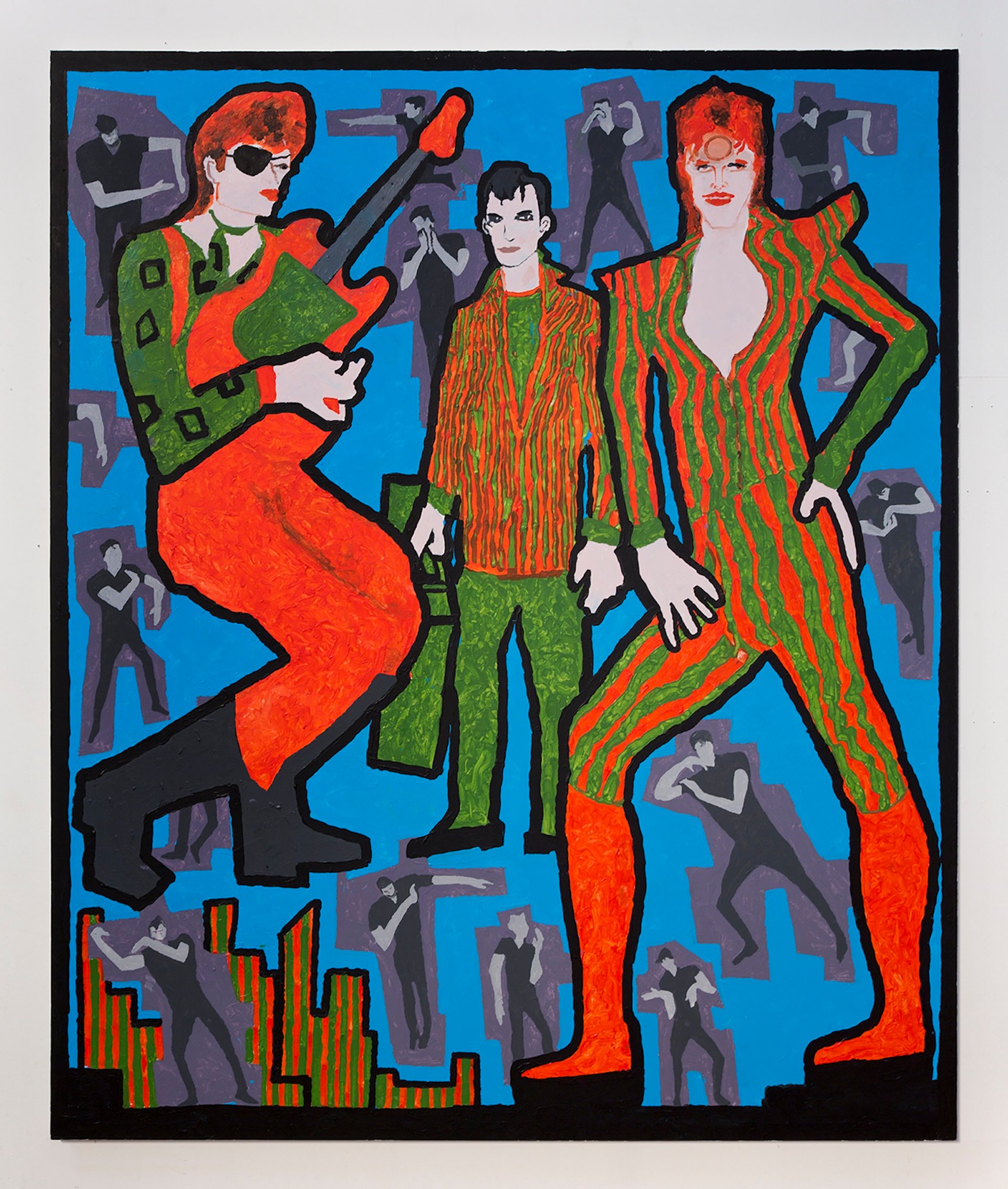 Like his former classmate Peter Blake, who co-created the cover image for The Beatles’ Sgt. Pepper's Lonely Hearts Club Band album, Boshier gained worldwide attention for his work with British musical acts, such as his cover art for the David Bowie albums Lodger (1979) and Let’s Dance (1983). The pre-Photoshop photographic image of Bowie on Lodger shows him lying on his back with his nose bent and his legs in a twisted position as though he were Major Tom having fallen back to earth. In 1978, the punk group The Clash included reproductions of the artist’s paintings and drawings in its songbook Give ‘Em Enough Rope.