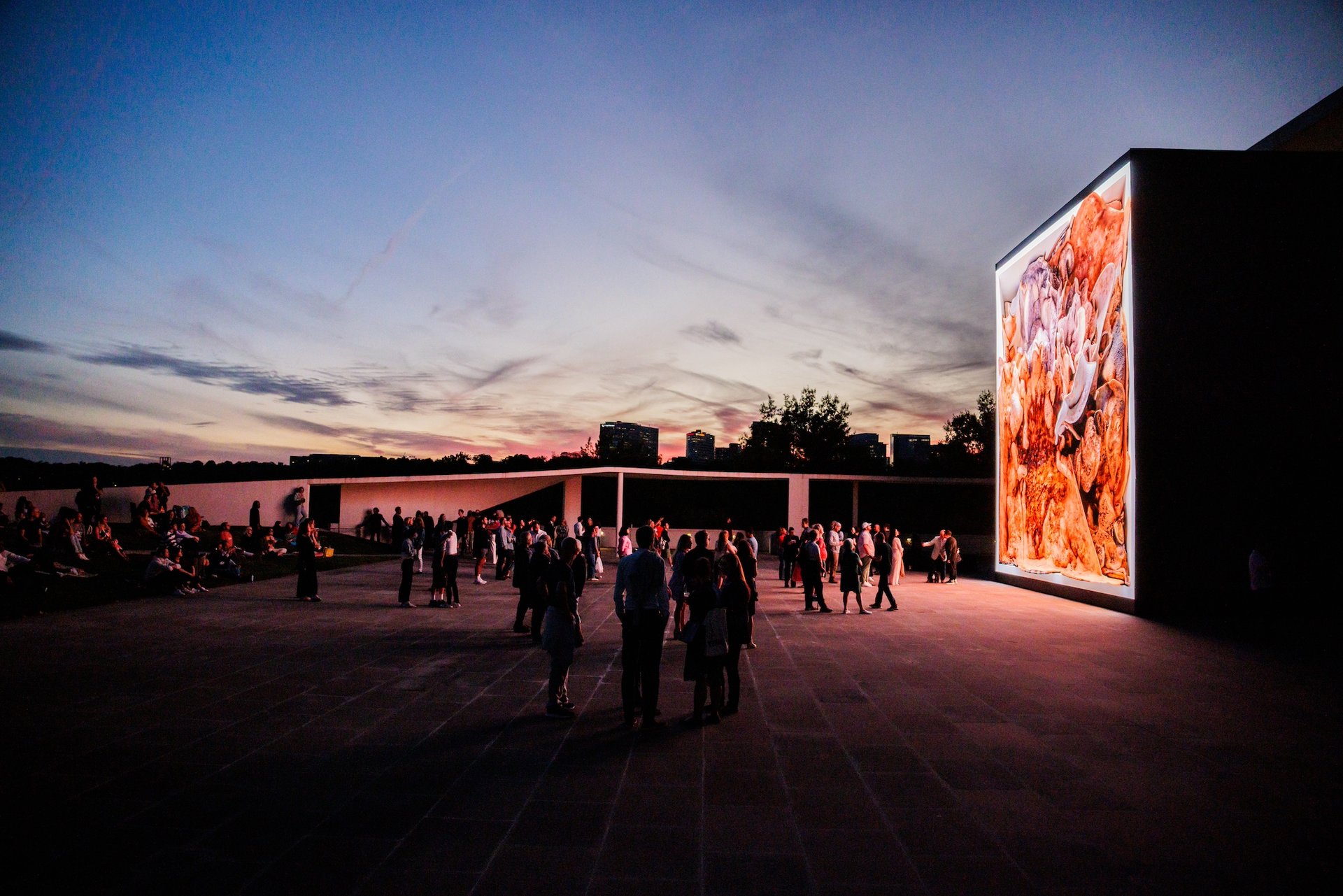 Audiences experience Dvořák Dreams by Refik Anadol, presented by 0xCollection and the Kennedy Center at the Reach Plaza Photo: elman studio. Courtesy of 0xCollection and The Kennedy Center