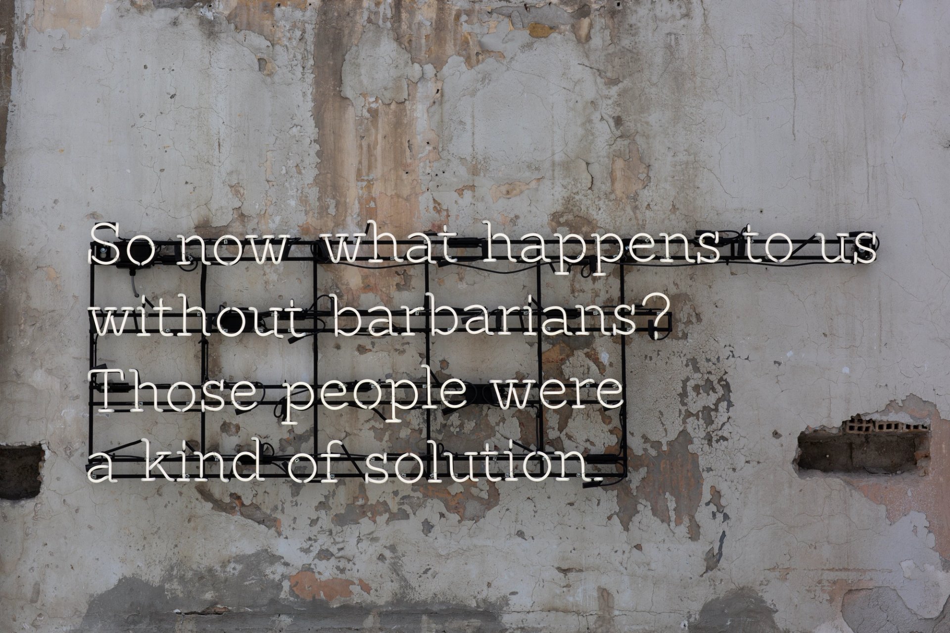 An installation view of Waiting for the Barbarians, (2021), at Portals, Hellenic Parliament + NEON at the former Public Tobacco Factory, Athens