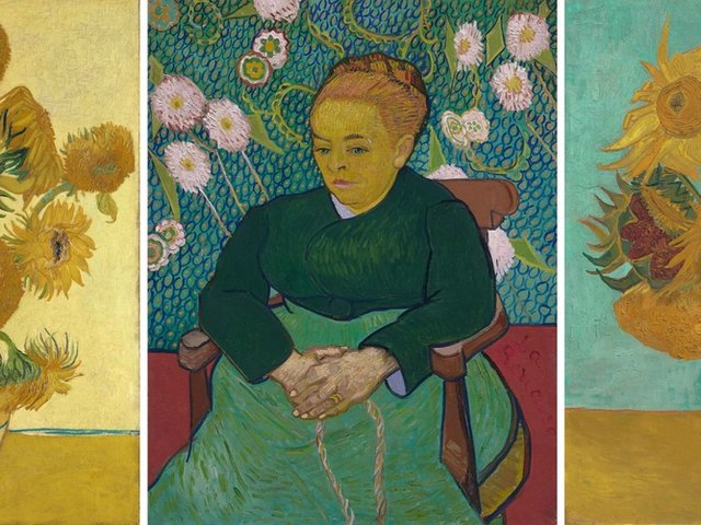 All the three paintings are displayed in imposing frames, hung some distance apart, although Van Gogh wanted them to almost touch, like an altar triptych. He envisaged them presented in simple, slender wooden frames. The two Sunflowers would have been in natural pine and the frame for La Berceuse painted red. Such an arrangement would have been quite impossible in a museum setting, where we expect masterpieces in appropriate frames and positioning. In Van Gogh’s time, he could not sell his work. This triptych could now theoretically be worth around a billion dollars.