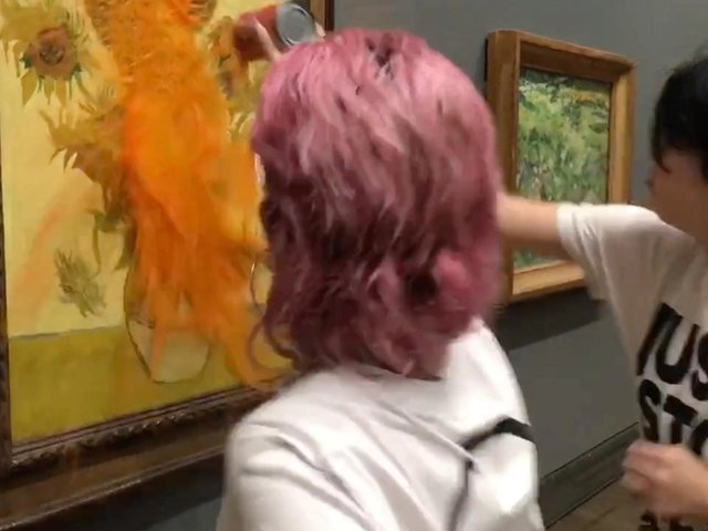At around 2:30pm, “three supporters of Just Stop Oil entered the Van Gogh exhibition at the National Gallery and proceeded to throw Heinz vegetable soup over two Van Gogh masterpieces: Sunflowers (1889) and Sunflowers (1888). The latter was splashed with soup by Plummer and Holland in 2022”, say the campaigners.