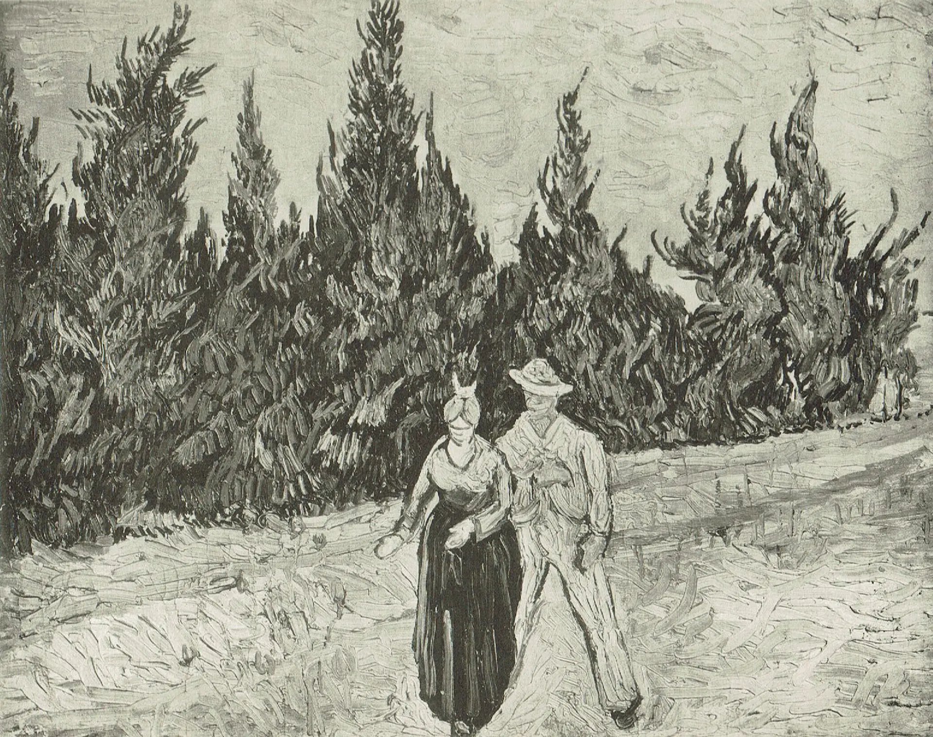 Van Gogh’s scene shows a courting couple, arm in arm, with the figure of the man bearing a resemblance to the artist. They stroll past a row of his favourite cypresses. The setting was inspired by the small public park just in front of the Yellow House in Arles, which Van Gogh dubbed “the poet’s garden”.