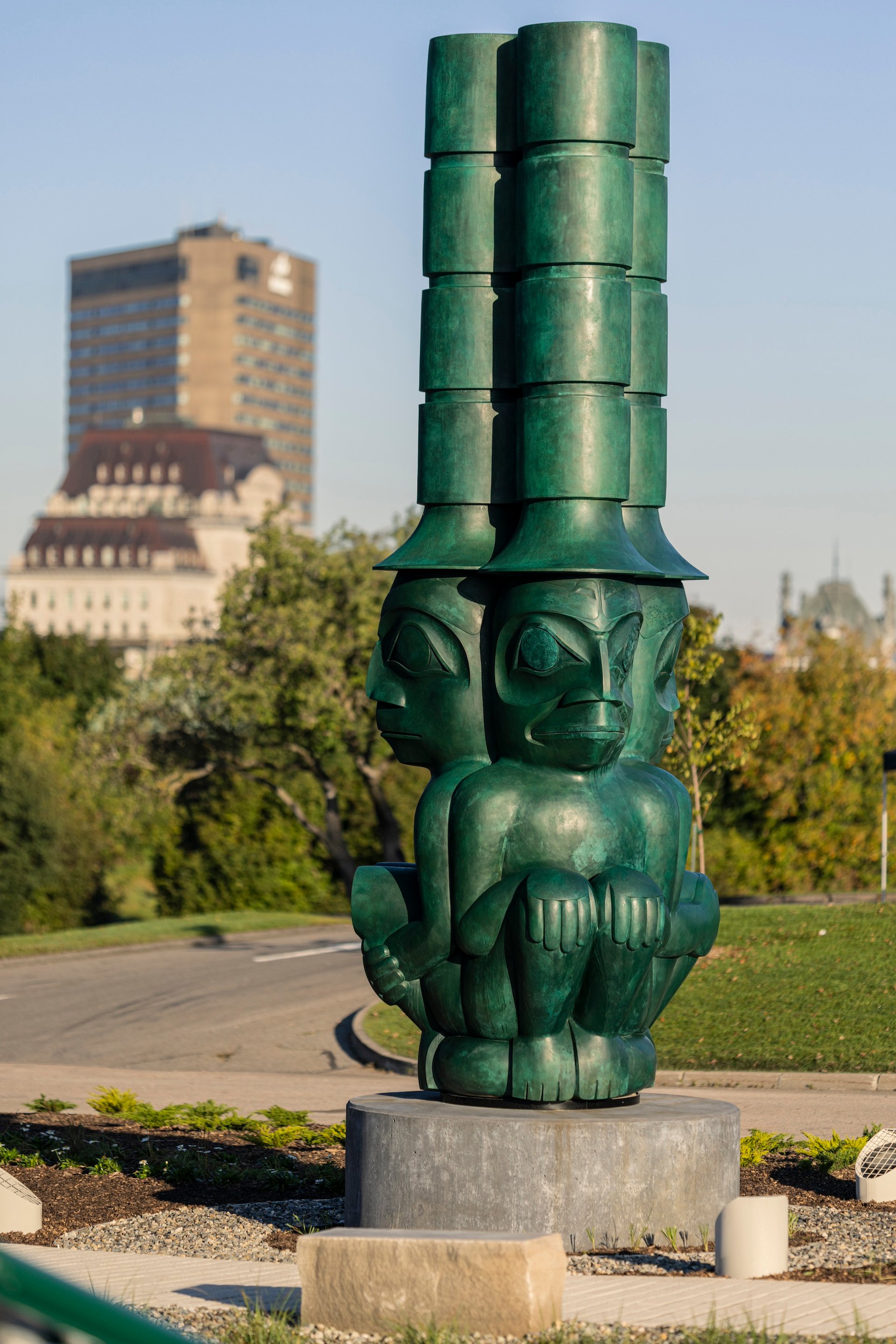 Hart’s work is a 6m-tall, 10,000lb bronze sculpture in a jade green patina finish depicting three sentinels standing guard atop the totem poles that stand in the villages of the Haida Gwaii archipelago on Canada’s west coast. Seated back-to-back, these watchmen represent the legendary guardians of the Haida Nation.