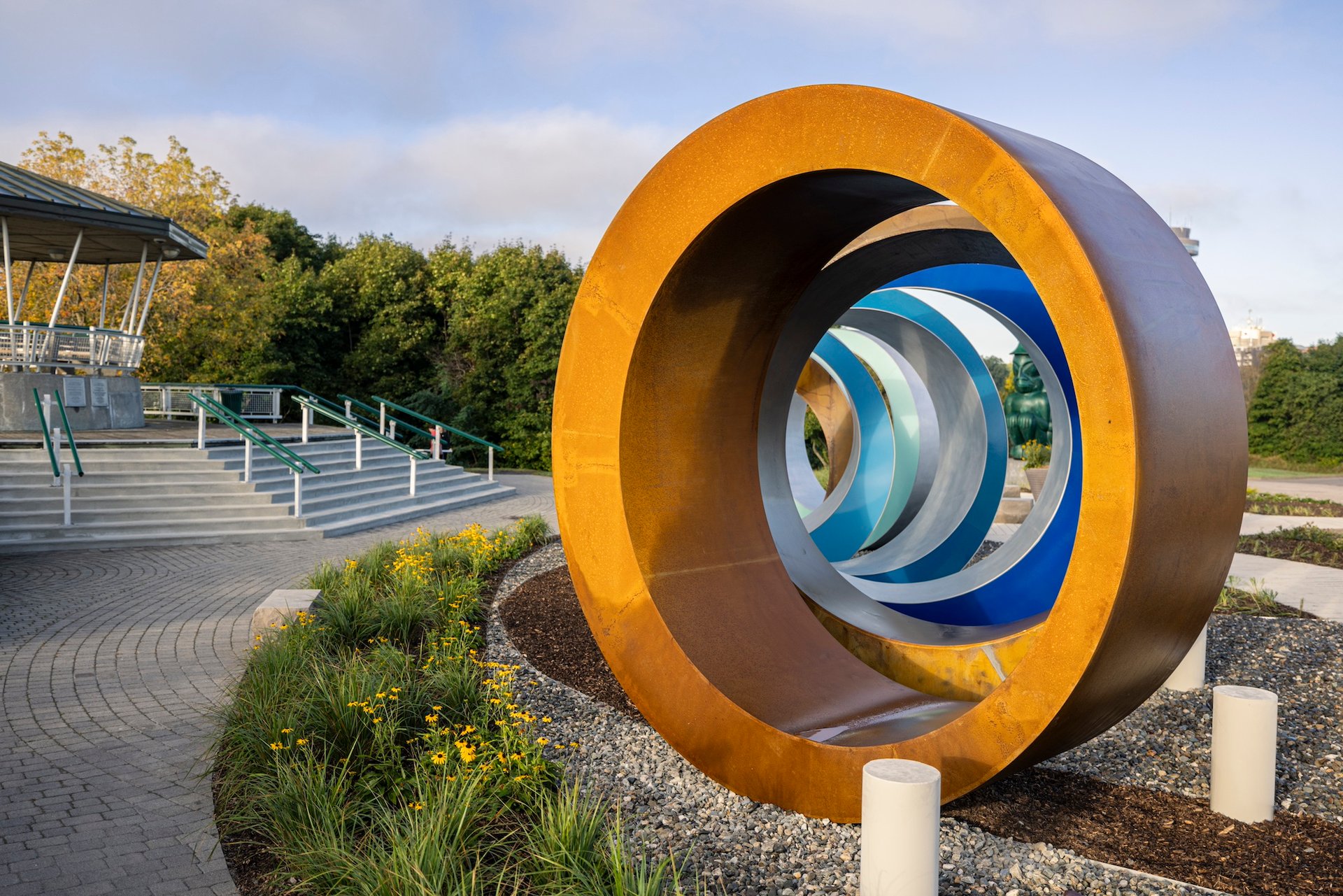 Traditionally made from seashells, these tubular purple and white beads can be strung together to form belts or woven necklaces. These items were ritually exchanged to seal diplomatic alliances between nations or to inscribe them in memory. Boney says the colours and materials he used—Corten steel left in its natural state as well as other rings painted iridescent silver and blue—were symbolic of both the past and new beginnings. He hopes visitors to the site will engage with the work and walk through its rings.