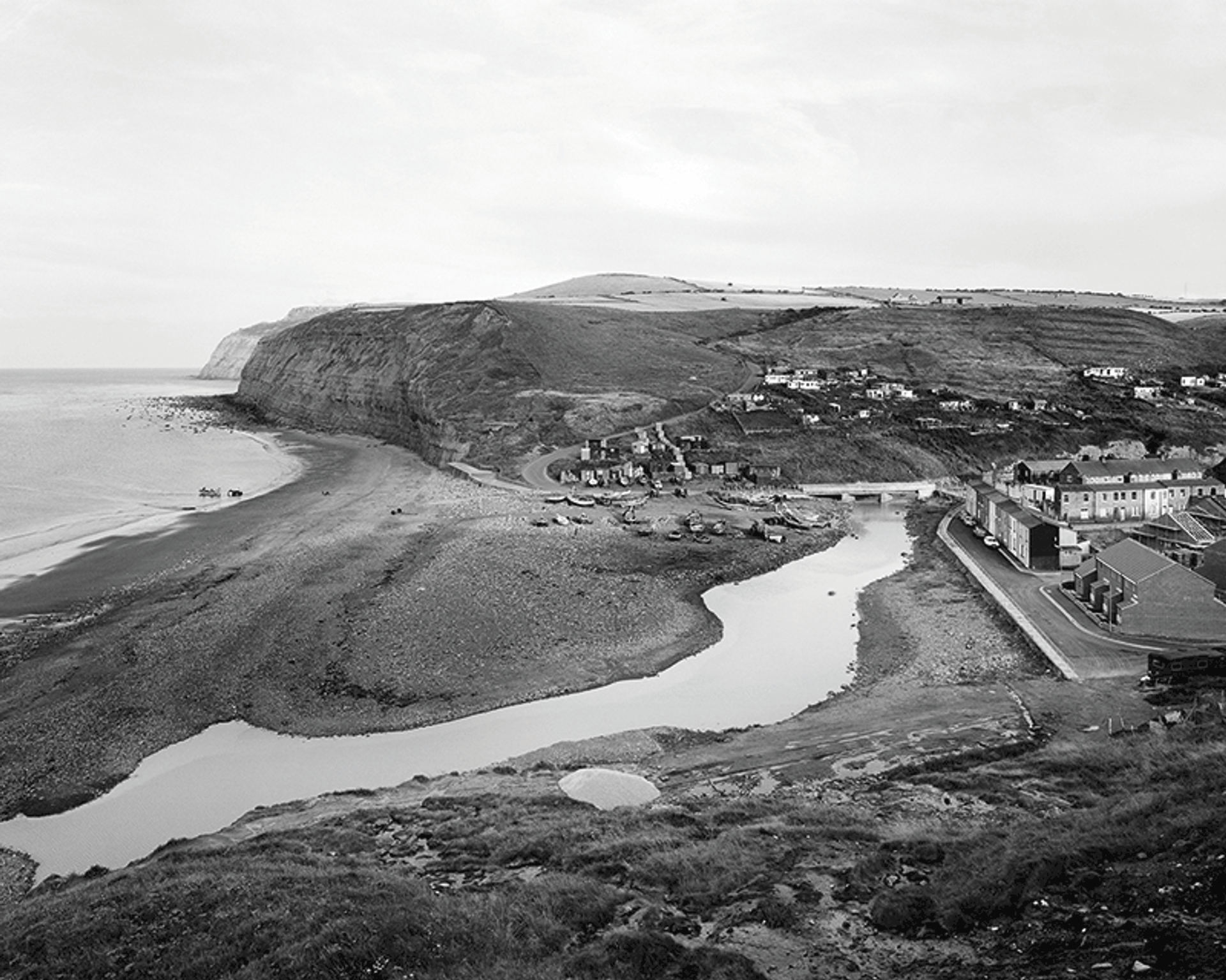 “Skinningrove lies … halfway between Middlesbrough and Whitby.” Thus begins Killip’s introductory note to this superb photobook from the independent publishers Gregory and Rachel Barker. “Hidden deep in a steep valley”, he continues, “it veers away from the main road and faces out onto the North Sea. Like a lot of tight-knit fishing communities, it could be hostile to strangers, especially one with a camera.” Killip’s sense of Skinningrove as a hidden, almost secretive environment is apparent from the opening picture: a cinematic establishing shot, taken from a vantage point along the coast looking down over the tiny village—a few thin terraces, an empty street, a congregation of fishing boats down on the beach—with a little scrap of silver river (Skinningrove Beck) snaking wearily inland, as though the village were connected to the landscape by a single thread. Skinningrove’s status, in Killip’s mind, as a place between places gives his photographs an added sense that we are seeing something that we should not, a community that may not wish to be observed.
