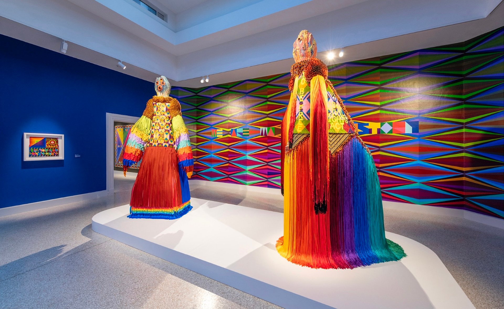 Installation view of the space in which to place me, Jeffrey Gibson’s exhibition for the United States Pavilion at the 60th Venice Biennale (until 24 November), including from left to right: IF NOT NOW THEN WHEN (2024), The Enforcer (2024) and WE WANT TO BE FREE (2024). Mural: WE ARE MADE BY HISTORY (2024) Photo: Timothy Schenck. All works © Jeffrey Gibson. Courtesy the artist and Hauser & Wirth