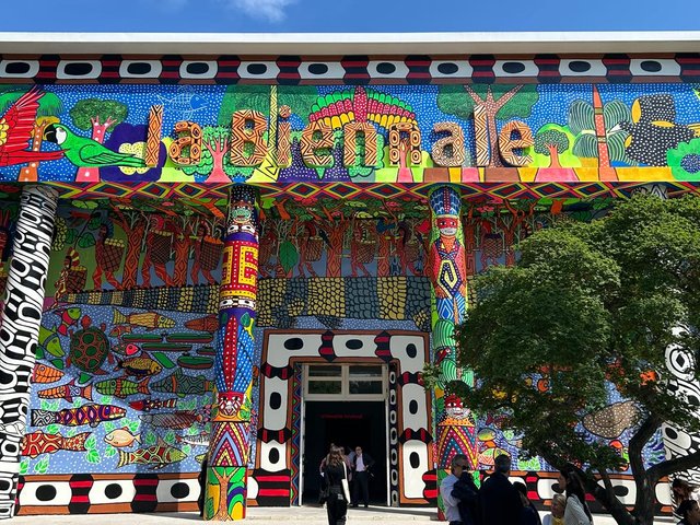 Known for his brightly chromatic paintings and sculptures incorporating found phrases and traditional Indigenous processes and materials like tin jingles, elk hides and beadwork, Gibson’s practice often also includes elements of installation and performance. His riotously colourful transformation of the US Pavilion in Venice incorporates exterior murals and a bright-red sculptural platform for performances and other public events.