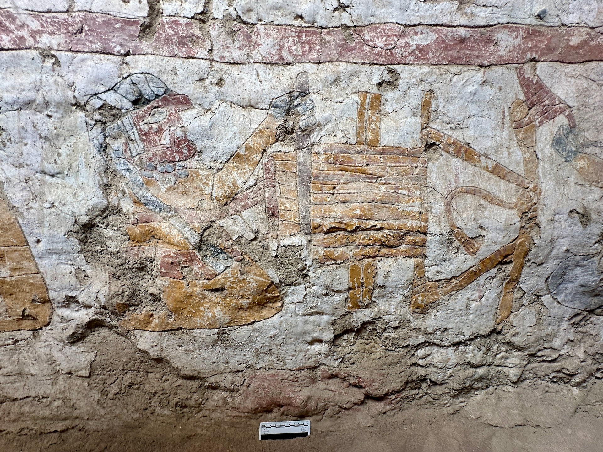 View of the crowned woman with scepter (upper left), procession of men behind her carrying objects (upper right) and textile workshop (below) painted on a wall revealed within the Hall of the Moche Imaginary in 2024 Photograph by Lisa Trever