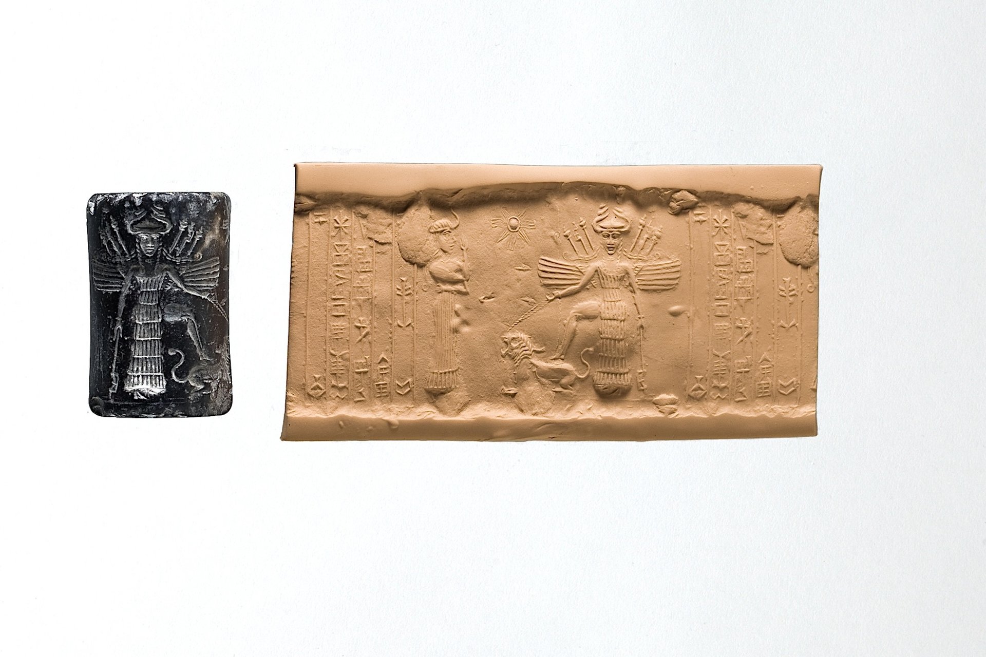 Cylinder Seal: Goddess Inanna (Ishtar) in her Warrior Aspect with a Lion and the Planet Venus, Approached by a Worshipper, Iraq (Akkadian), around 2334BCE-2154BCE, featured in Mapping the Infinite: Cosmologies Across Cultures at the Los Angeles County Museum of Art Institute for the Study of Ancient Cultures, University of Chicago