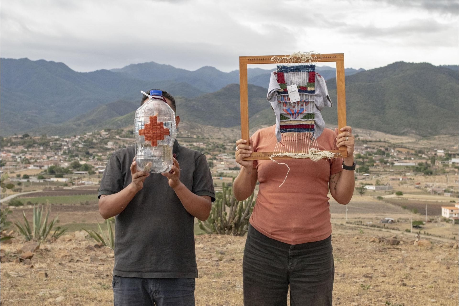 Artists Porfirio Gutiérrez and Tanya Aguiñiga hold their weavings in front of their faces on a hill near Gutiérrez’s hometown in Teotítlan del Valle, Oaxaca Photo: Javier Lazo Gutiérrez