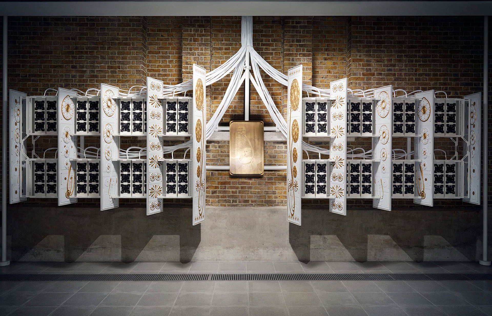 The Hearth: an organ-like instrument, containing 96 GPU cooling fans, which greets the visitor to The Call, the AI choral show Holly Herndon and Mat Dryhurst created with the architectural practice sub, at Serpentine North, London © Leon Chew. Courtesy of Serpentine