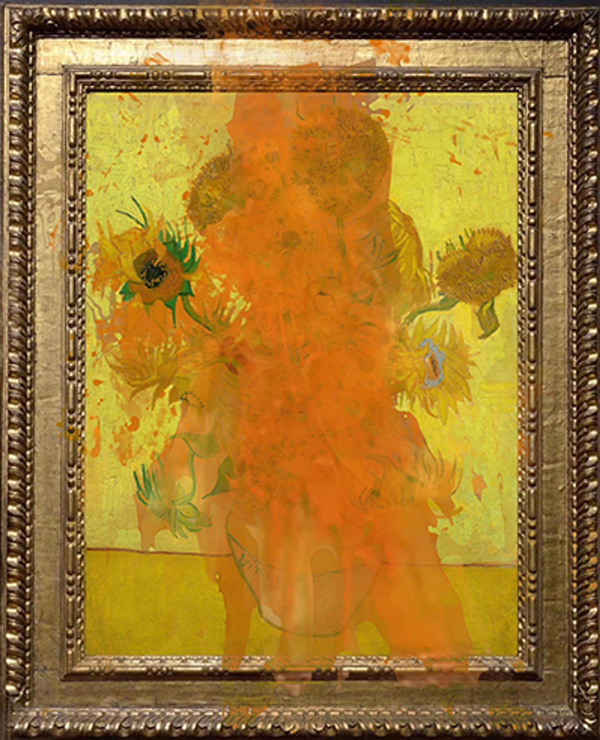 The artist duo, the Connor Brothers, have made their own version of Vincent van Gogh’s splattered Sunflowers, which was doused in tomato soup by two activists from the Just Stop Oil campaign group in October 2022. Last month, the pair who hurled the gloopy foodstuff on the famous work at London’s National Gallery—Phoebe Plummer and Anna Holland—were given jail sentences, prompting the artists to recreate the messy masterpiece.