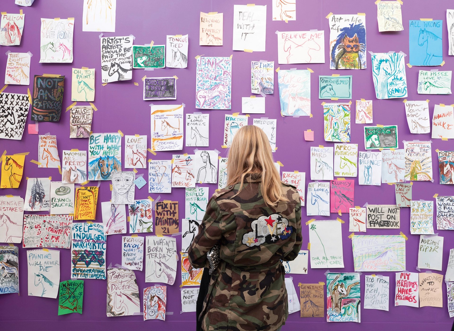 Murray-Wassink’s installation features hundreds of confessional, defiant and funny watercolours with quickly drawn images and text, selected from 3,000 amassed over a decade. He explores his queer identity, his bipolarism and his debt to great female artists including Carolee Schneemann, Hannah Wilke, Adrian Piper and Eva Hesse. Their names appear in the works on paper, held up with masking tape around the stand. Equine forms dominate the imagery—a nod to the animal’s wildness, but also to a childhood experience in which the artist expressed his wish to be a girl and was encouraged not to draw horses as they were feminine symbols.