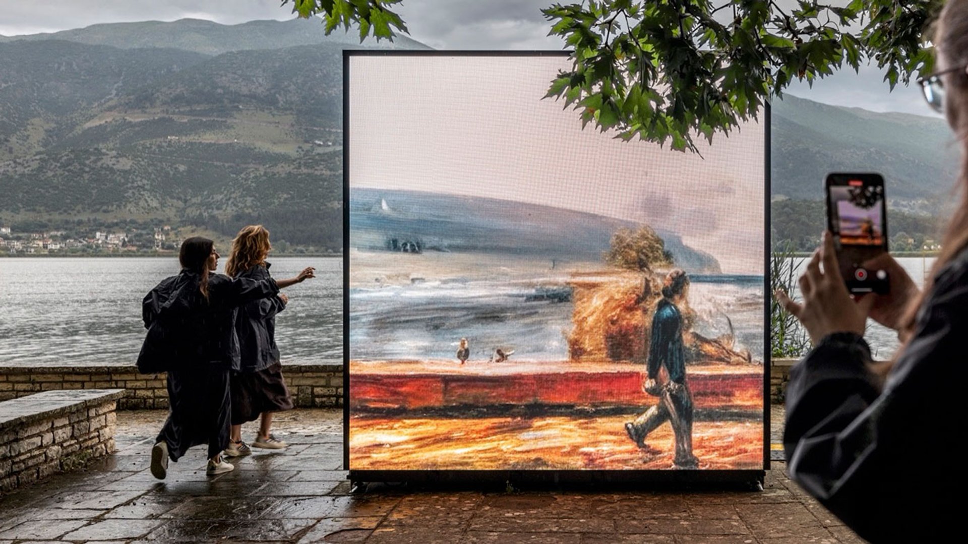 The New York-based interdisciplinary artists Marc Da Costa and Matthew Niederhauser designed Parallels, a responsive machine-learning installation that interacts with its surroundings to transform a square LED wall into a portal for visitors to encounter the world and themselves through the lens of a neural network. A camera at the rear of the large screen captures one image per second and from that generates a visual output based on environmental data and AI models trained on the art and visual histories of the site. Parallels was commissioned through Onassis ONX for Plásmata II: Ioannina.