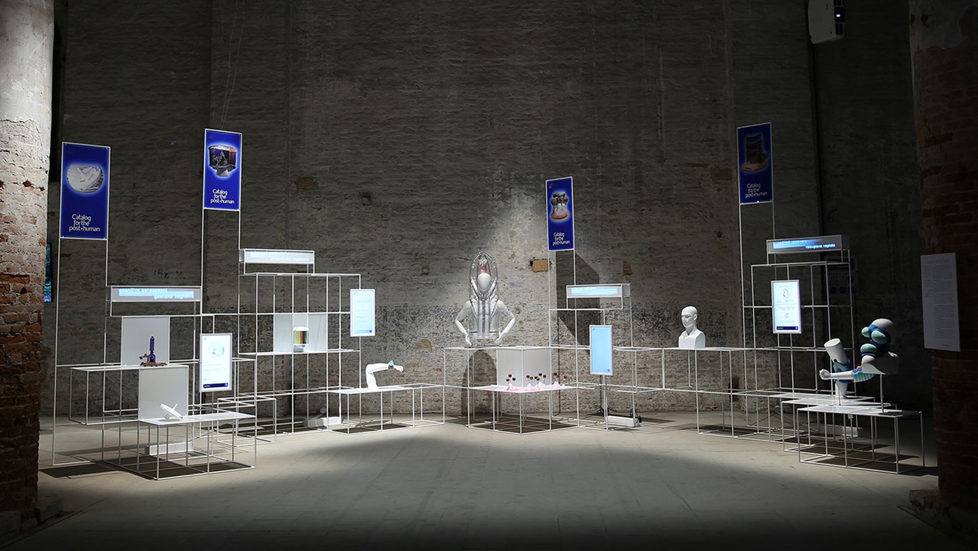 The design studio Parsons & Charlesworth, founded in 2014 by the Chicago-based British husband and wife team of Tim Parsons and Jessica Charlesworth, created Catalog for the Post-Human, a satirical multimedia installation, as if at a near-future technology company’s trade-fair booth, featuring fictional prototypes designed for human improvement. In their comment on workplace technologies and AI's impact on human work practices, the made-up prototypes include an inflatable jacket with built-in IV drip to remove the need for food breaks, and a set of tools for modifying the sleep cycle to align it with an economic algorithm.
