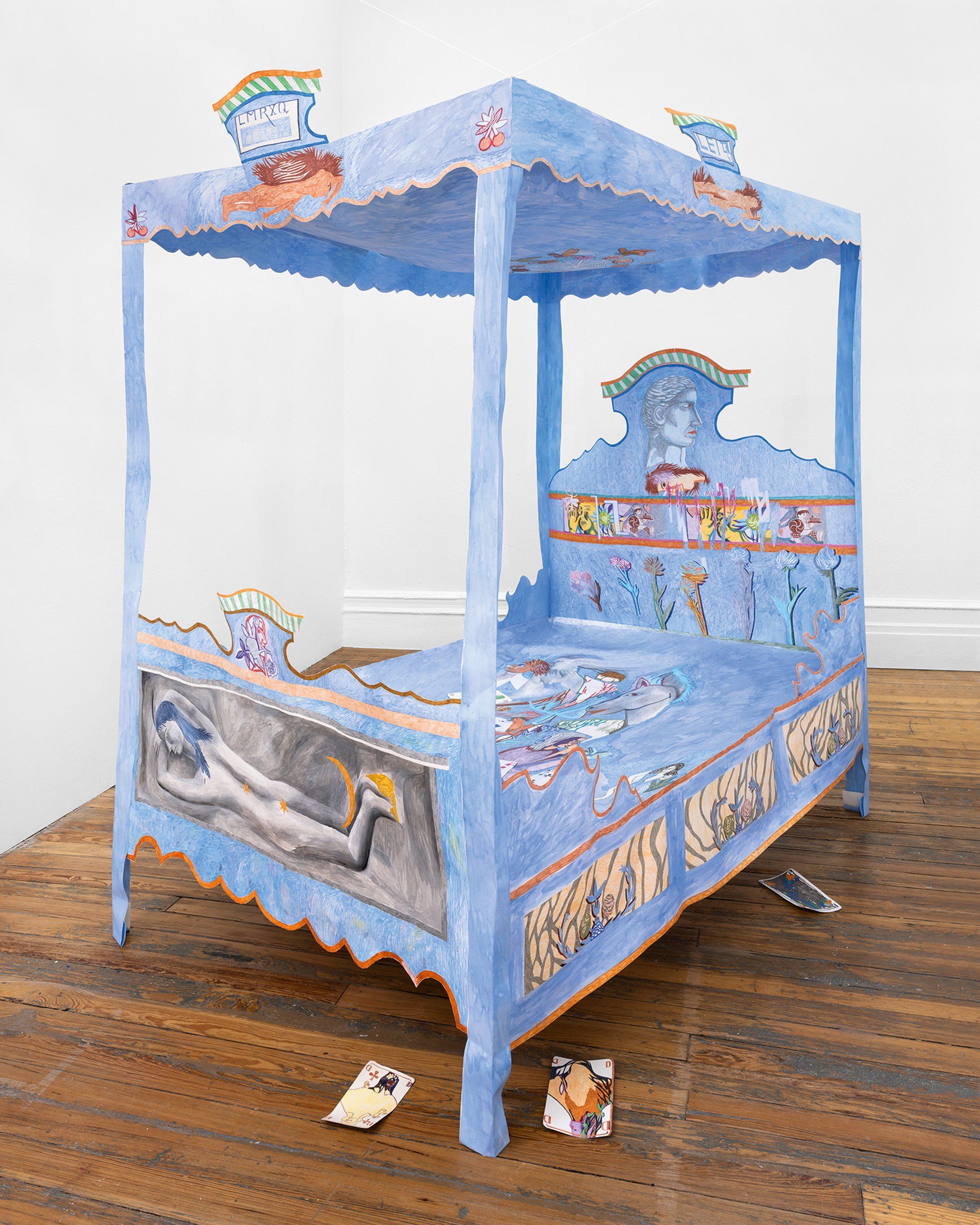 Sans Titre gallery is offering a peaceful refuge in the middle of its Art Basel Paris stand: a life-sized, four-poster double bed. But try resting on it at your peril—it is made entirely of paper. Fixed to the walls and ceiling with transparent strings, the 2m-tall sculpture is imposing but delicate. The artist, Agnes Scherer, has adorned the work (which was inspired by her own antique bed) with images and patterns