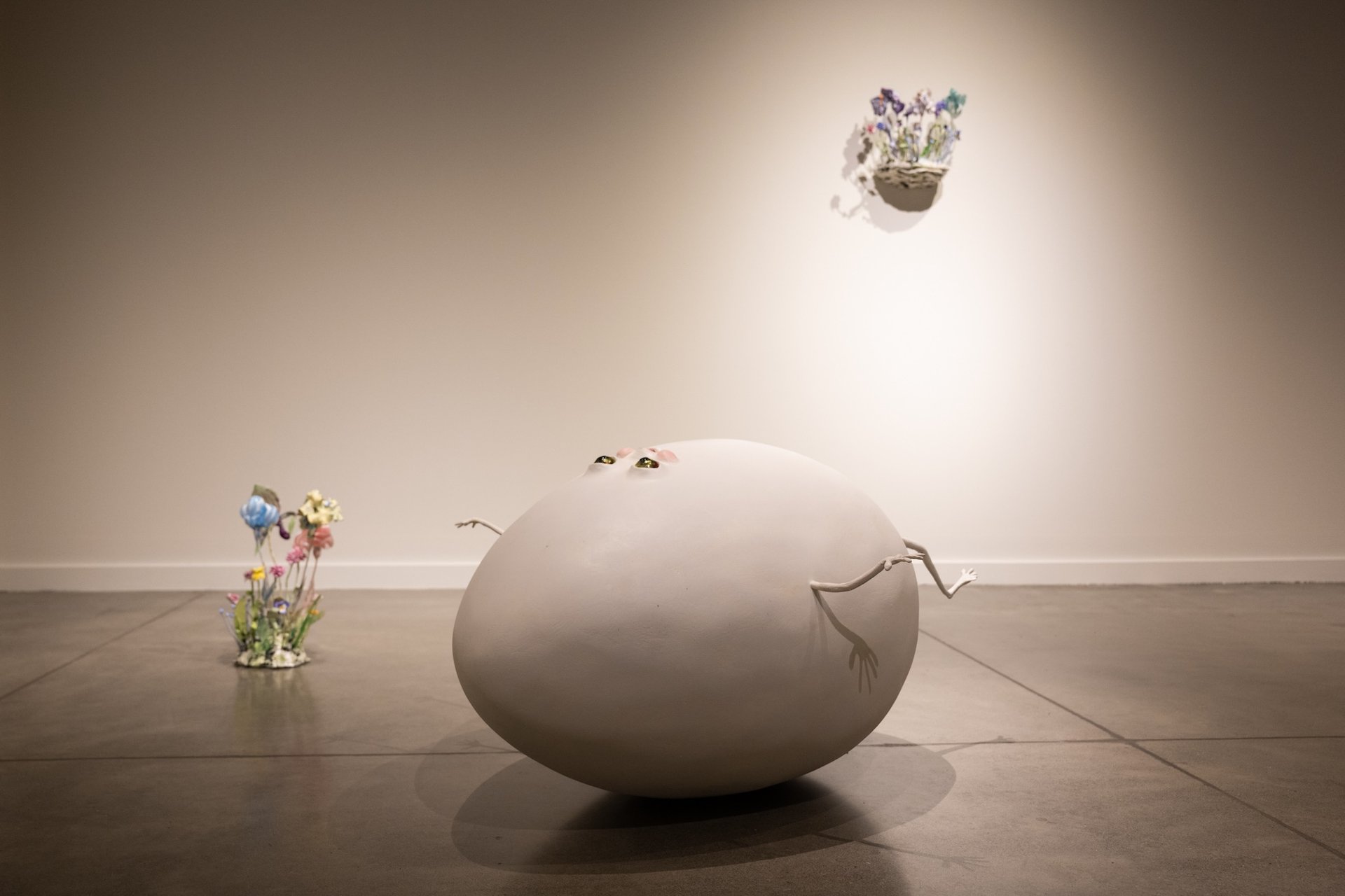 “It's so hard to describe a sculpture without it sounding mundane,” Berg says. “If you want to describe something, the description has to be bigger than what you want to describe. You can't say it's rocks with flowers and an egg. That's not all it is. It's very hard to say with words, but we wanted to make a world. And you go through this world where things are washed up and…”