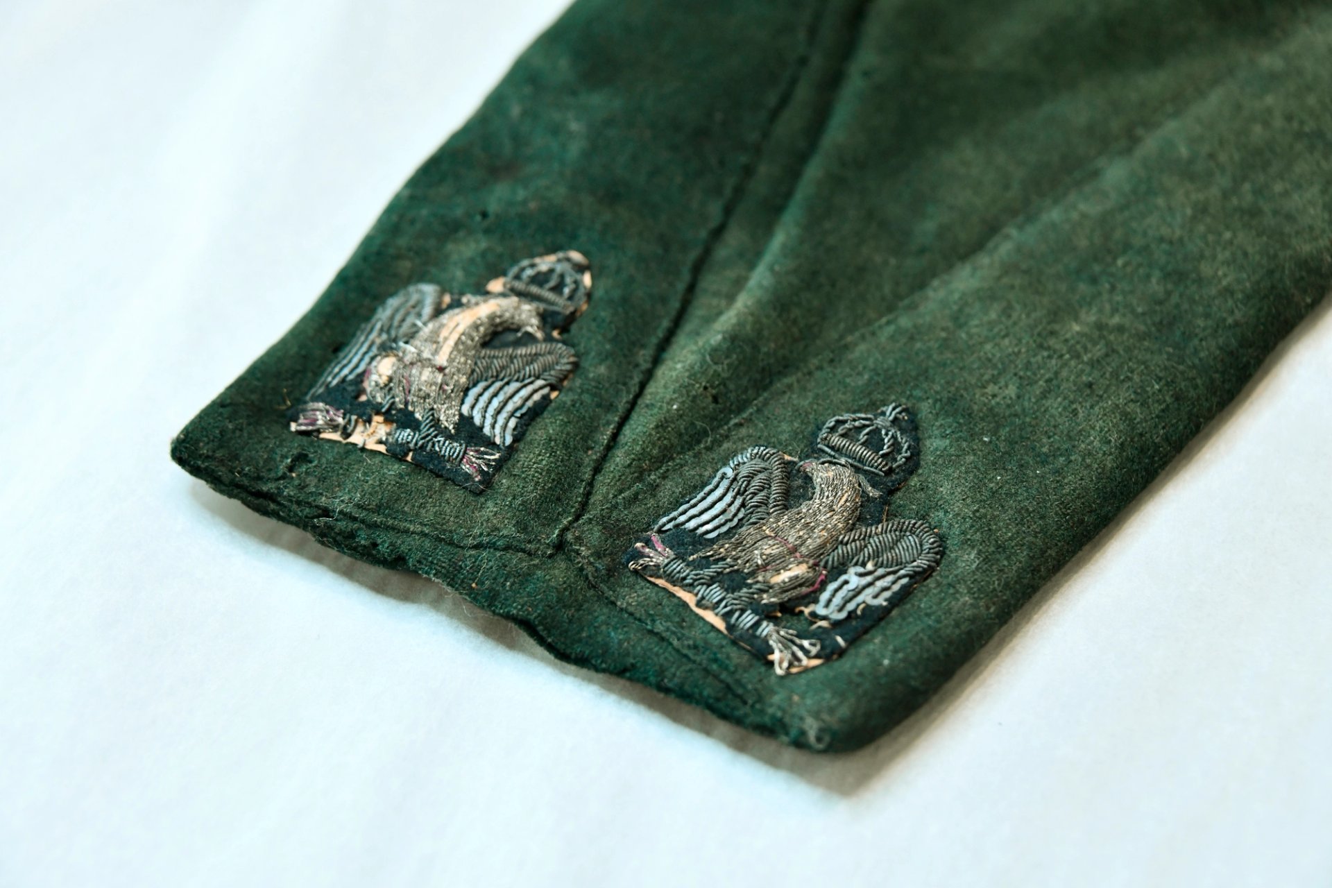 Katherine Gazzard, curator of art at the museum, says the dark green uniform of the French Imperial Customs Service was unquestionably genuine, and itself a very rare survival. It has silver lace at the neck, brass eagle buttons, silver gilt embroidered eagles on the cuffs, and the words Douanes Imperiales repeated on belt buckle and hat.