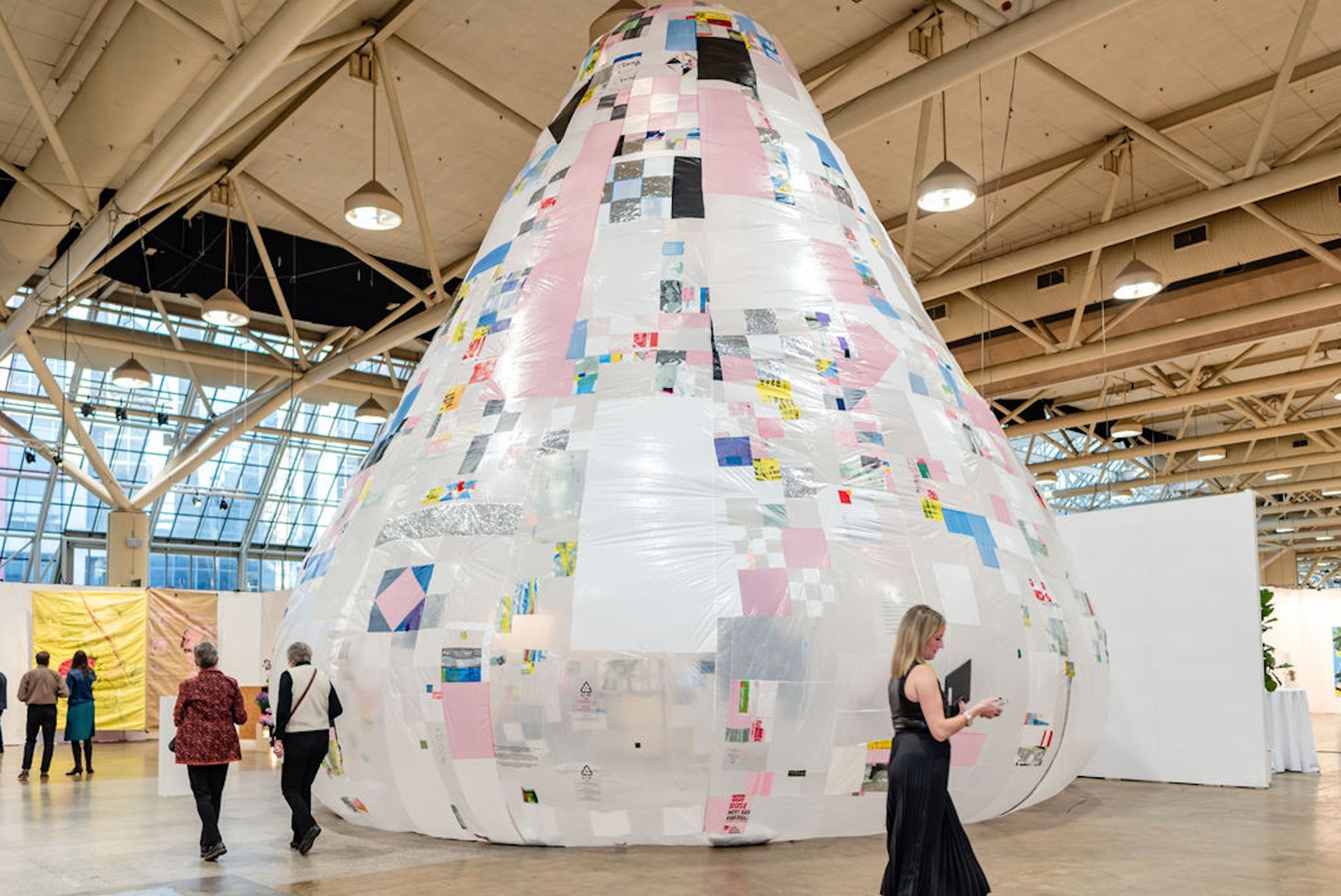 A large installation that looks like a giant plastic tent or hot air balloon, created by Studio Rat and presented by Arsenal Contemporary Art, functions as a participatory device and gathering place.