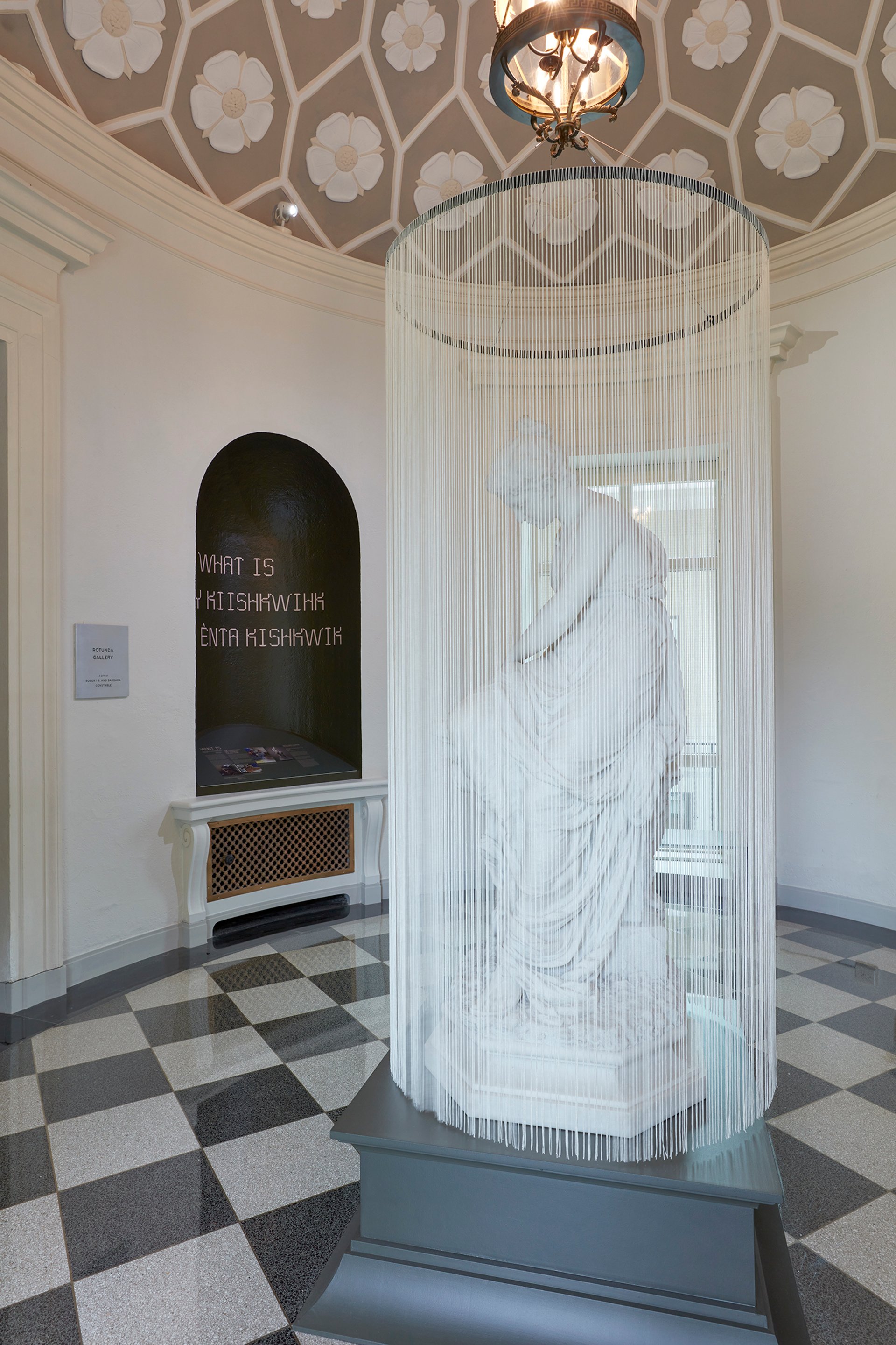 That impact lies not just in the power of the pieces themselves, but in the spatial friction between them. Nineteenth-century beaded awls and buffalo-hide bags live alongside specially commissioned interventions like the powerful installation What Was, What Is, What Will Be (2024) by the Delaware Nation artist Holly Wilson— a neoclassical marble sculpture from Mam’s permanent collection depicting a Greek woman adorned, in a signal of resistance, by a delicate Lenape shawl that rustles quietly as visitors walk by. Such a simple, poignant gesture upends long-held colonial narratives of authorship, an ideological thread running through the entirety of Interwoven Power.