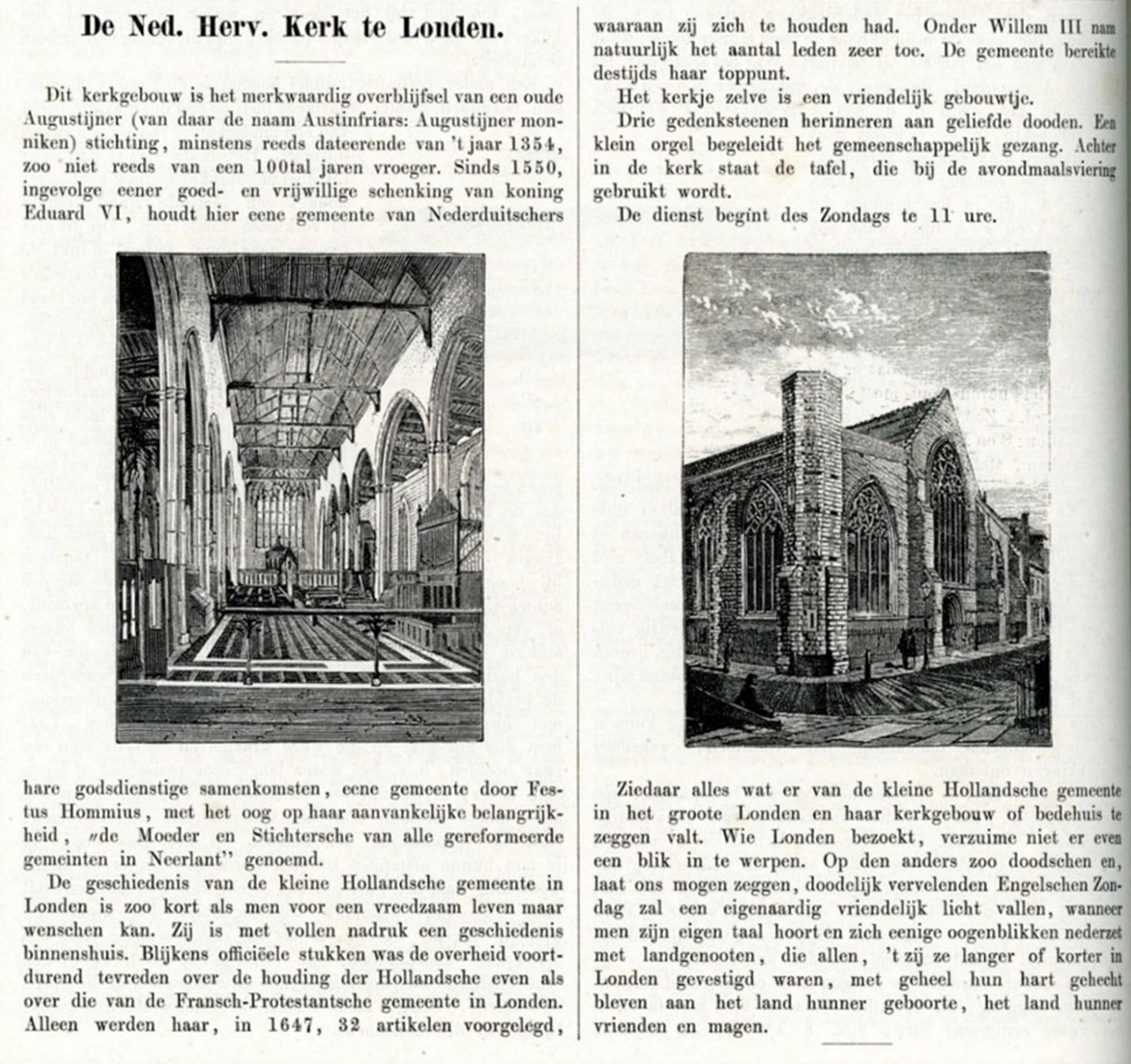 De Brouwer found further evidence that Van Gogh had used Eigen Haard. Beneath his drawing Van Gogh wrote a short text, which translated reads: “This little church is a noteworthy survival of an old Augustinian foundation (Austin Friars) dating from at least the year 1354 if not a hundred years earlier. The Low German [Dutch] community has held its religious services here since 1550, thanks to a voluntary donation of Edward VI.” This text seems to be a summary of the first two paragraphs of the accompanying Eigen Haard article.