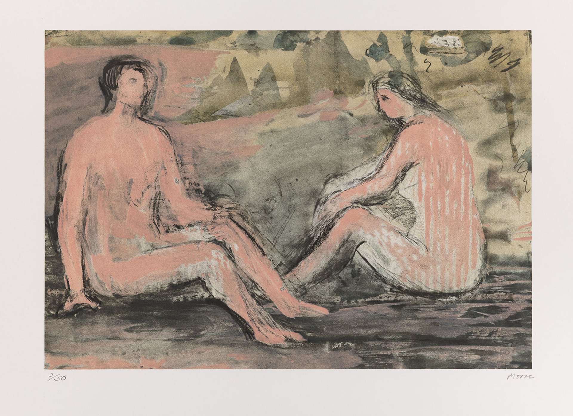 Henry Moore, Man and Woman in Landscape, 1984, one of three previously unpublished prints from a cycle of seven lithographs and etchings released by the Henry Moore Foundation on the occasion of the 2024 Athens exhibition © The Henry Moore Foundation. Photo: Prudence Cuming Associates Ltd. Courtesy Gagosian