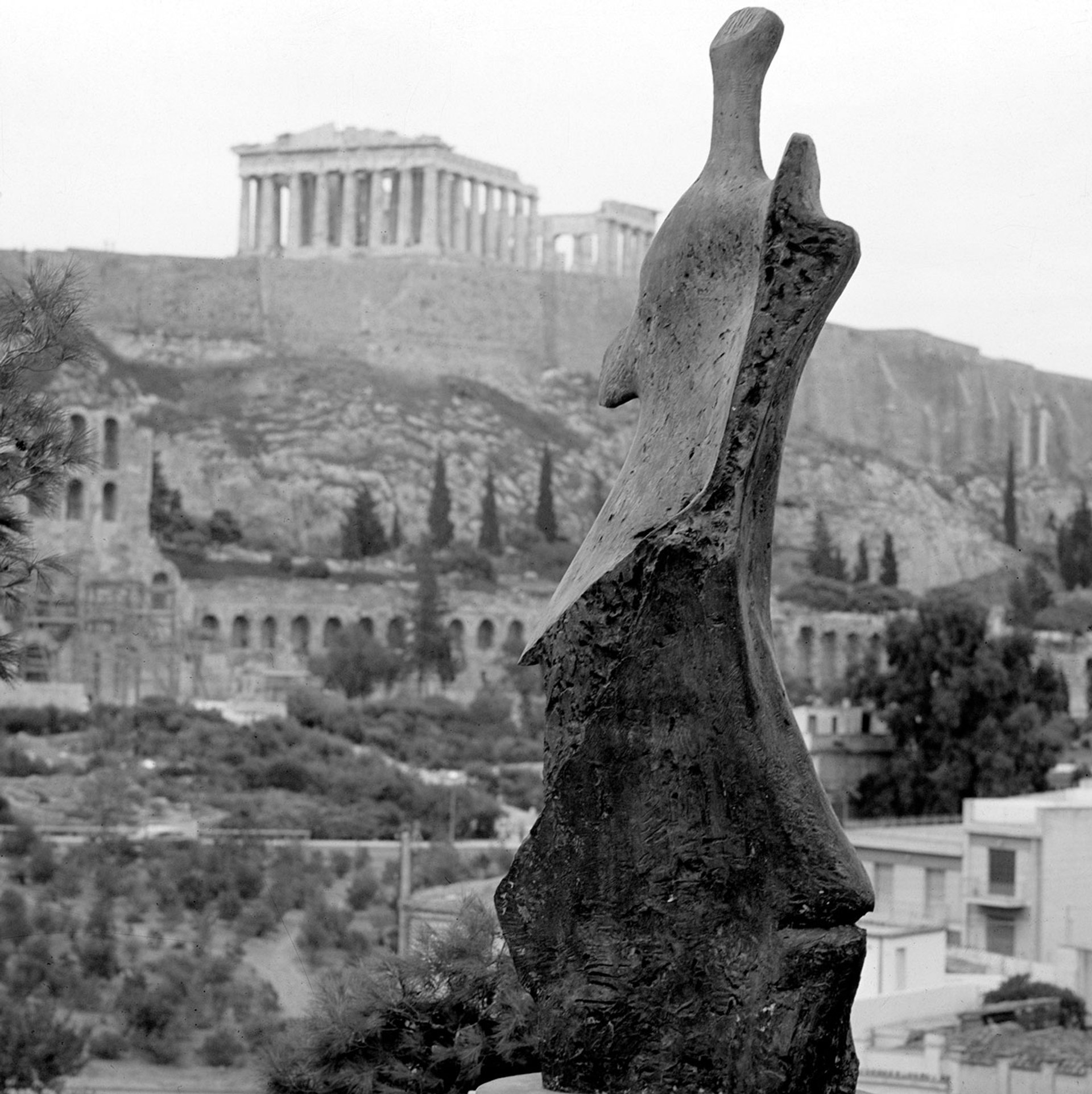 Henry Moore, Standing Figure: Knife Edge (1961) installed on Philopappos Hill opposite the Acropolis as part of the First International Exhibition of Sculpture, Athens Festival, 1965 © The Henry Moore Foundation. Photo: Henry Moore Archive. Courtesy The Henry Moore Foundation Archive