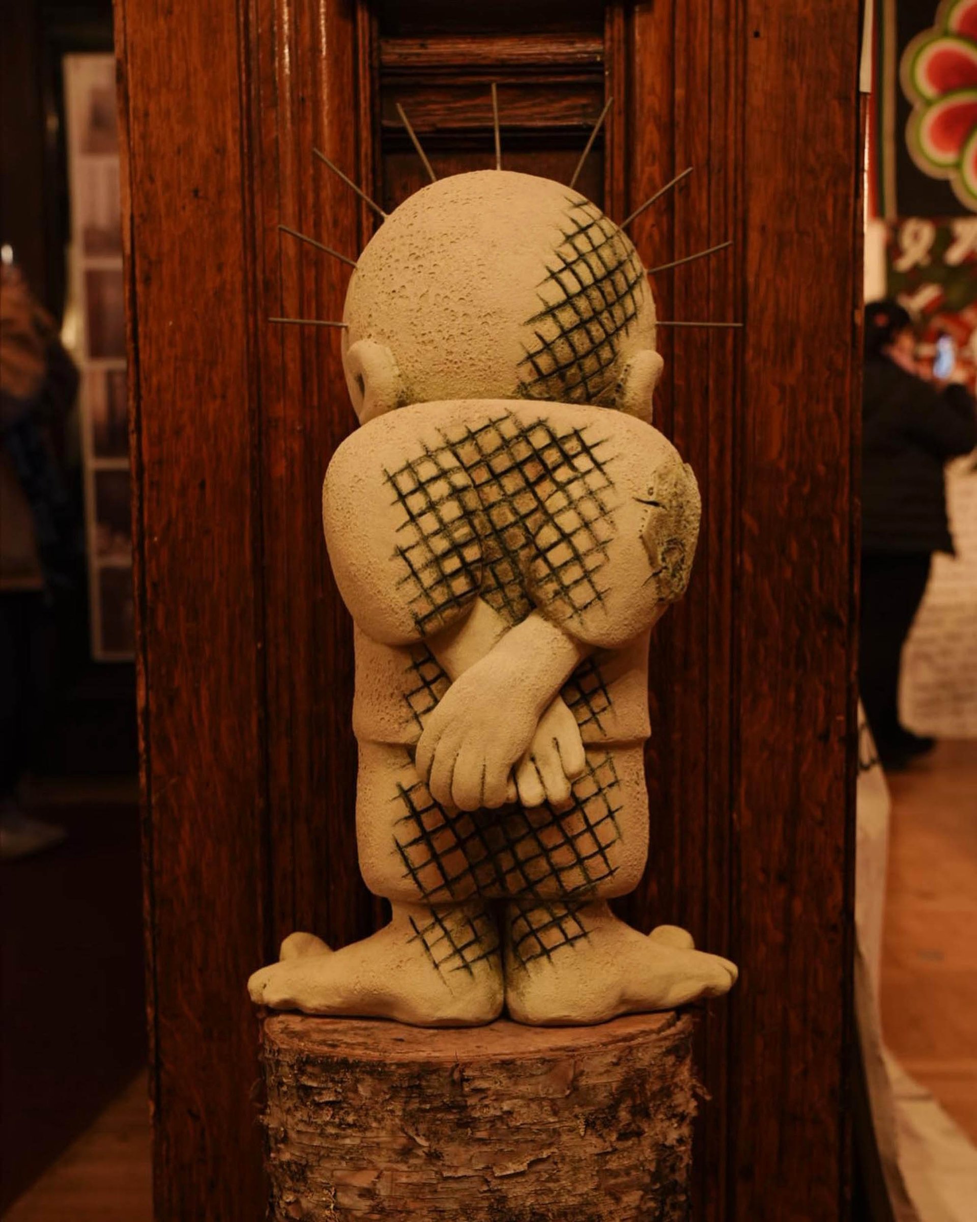 The artist Peloloca took part in Hind's House with a piece titled The Handala Project, which had previously been installed on a street corner in Queens this summer. The sculpture draws on imagery from a cartoon that was created by Naji al-Ali in 1969 following the 1967 Arab-Israeli war, featuring a boy with spiky hair shown from the back in tattered clothes.