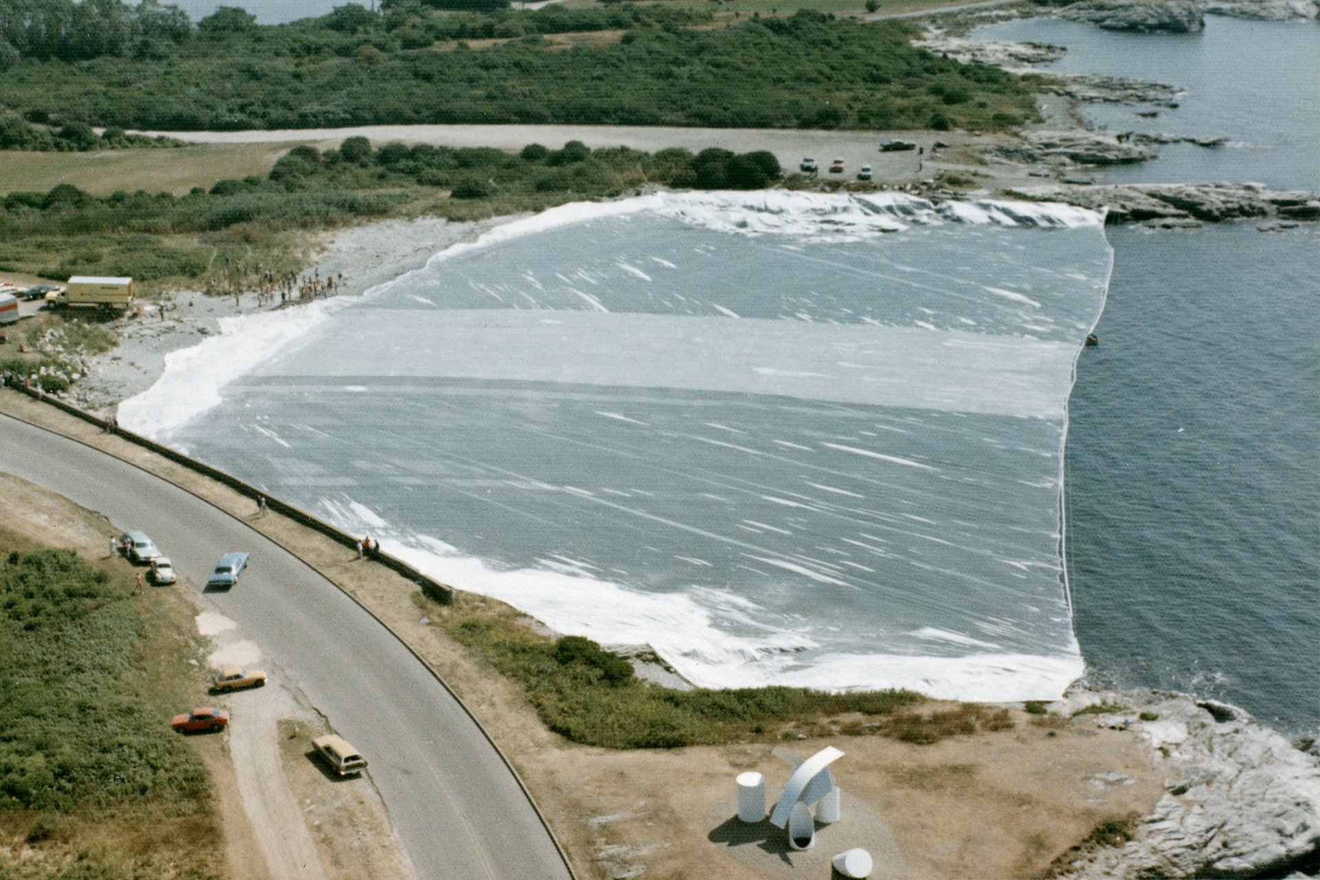 Christo, Ocean Front Project at King’s Beach, Newport 1974. Width, 420ft; depth, 320ft; 14,800 sq. yards of woven polypropylene fabric floating on the ocean and attached inland to 40 anchors. Featured in Monumenta exhibition, 1974, where it was installed at King's Beach. Lent by the artist. Photo courtesy of William “Bill” and Gael Crimmins