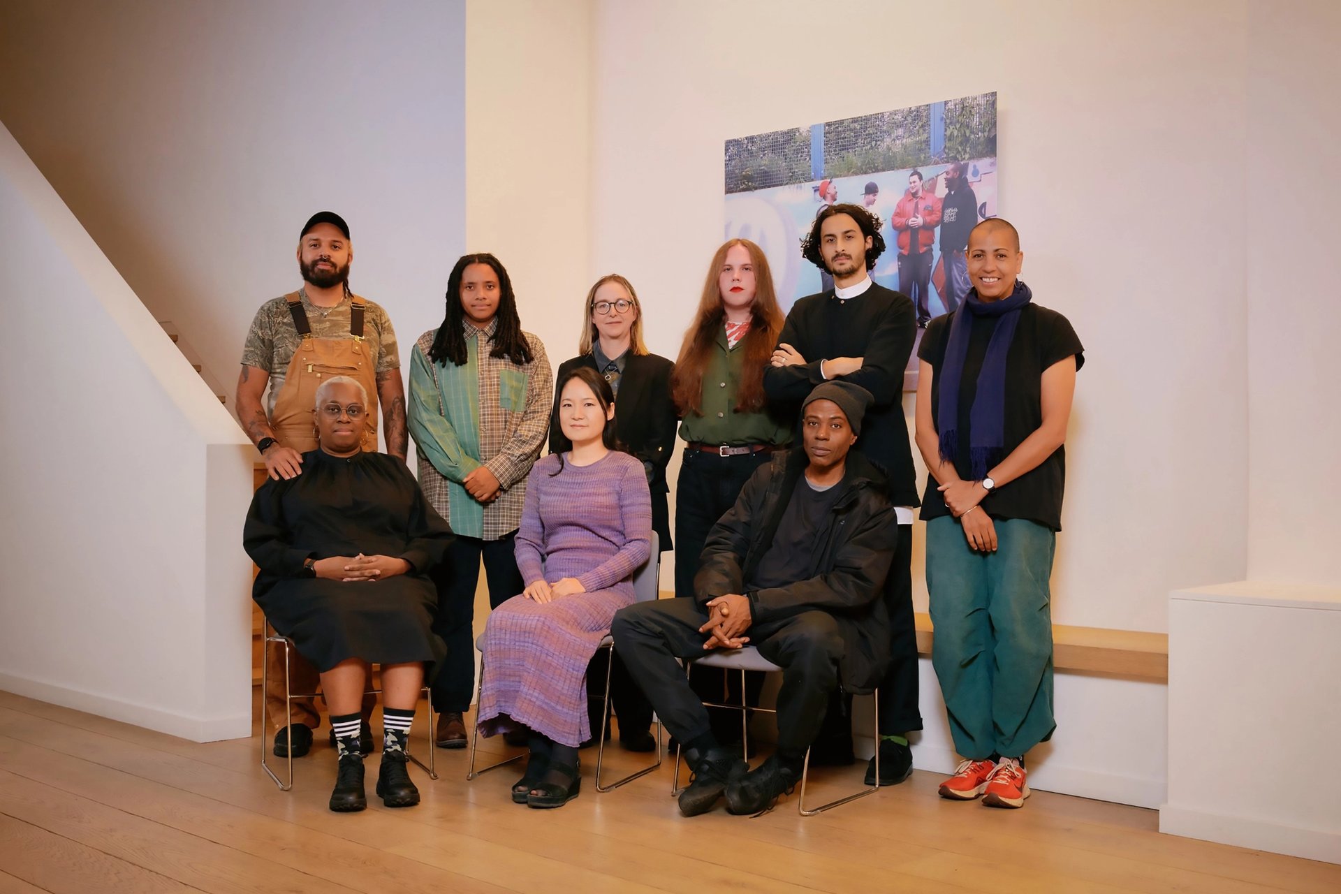 A selection of the 2023 cohort: (Back row, left to right) Marcus Macdonald on behalf of Black Obsidian Sound System (B.O.S.S.), Nneka Cummins, Pippa Murphy, Jamie Crewe, Imran Perretta, Helen Cammock. Front row, left to right: Ain Bailey, Hyelim Kim, Edward George. Not pictured: Francesca Pidgeon (Dilettante), Karine Polwart (part of composing duo with Pippa Murphy), eight other members of Black Obsidian Sound System