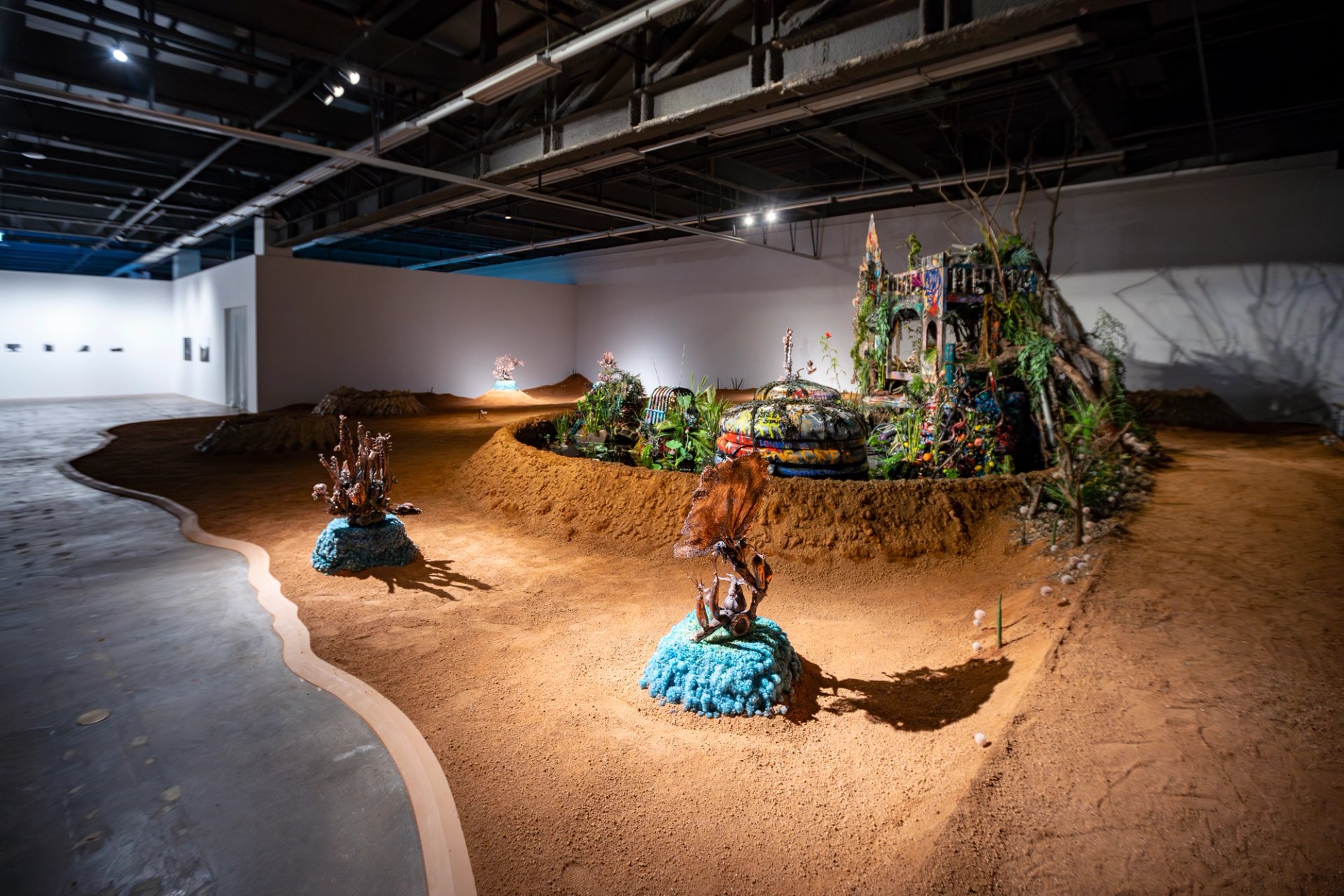 The music accompanies Wang’s compelling, repellent footage of slurping sludge, algae blooms, all manner of ecological degradation, interspersed with close-ups from factories assembling plastic diorama landscapes. Humanity is destroying the real to build artifice. The music particularly washes over Max Hooper Schneider’s adjacent installation Lysis Field, a life-size fake landscape echoing those manufactured in Green Grey Black Brown 2024.