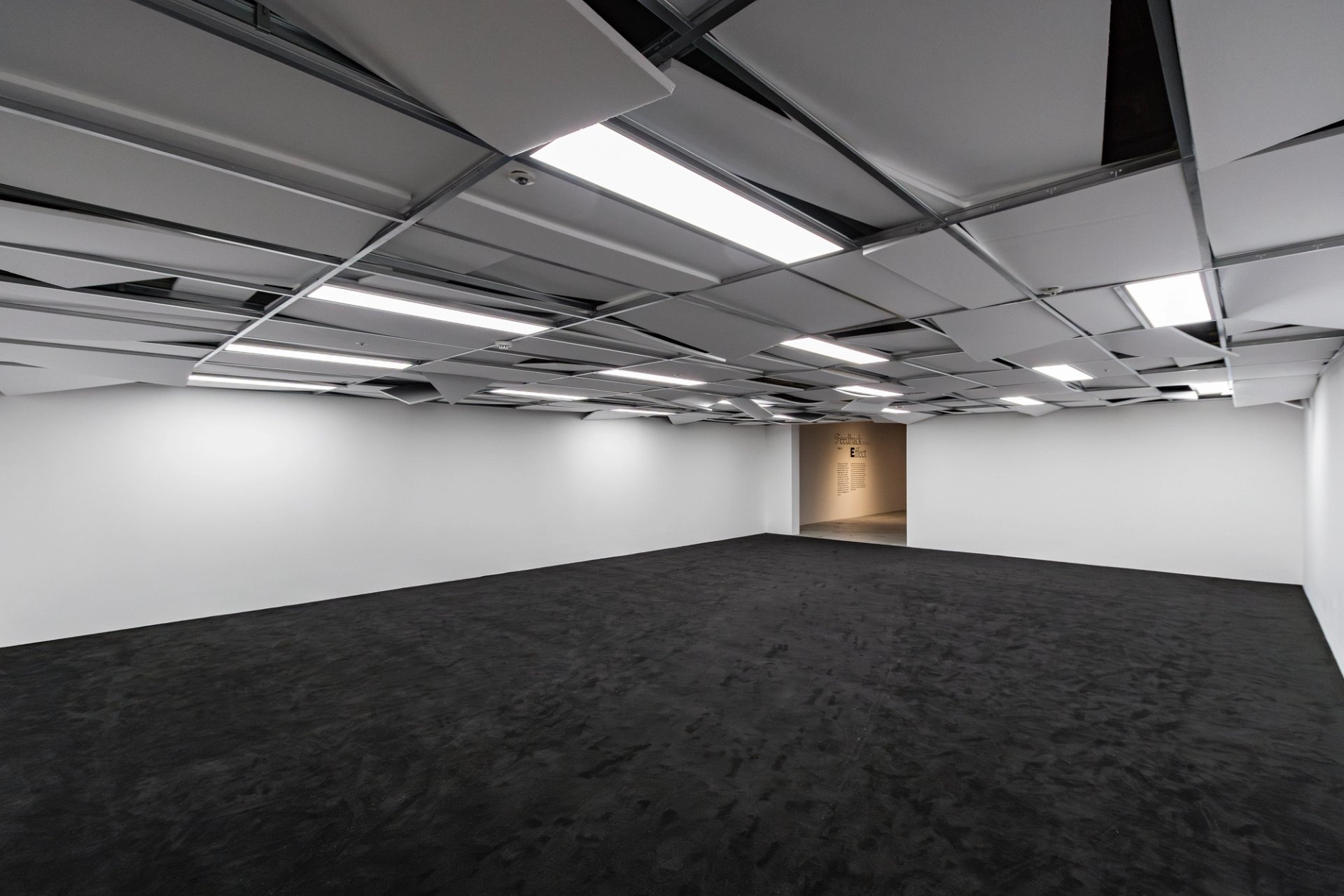 The show opens with a literal black box: Emeka Ogboh’s dark hallway playing Oju 2.0 (2022), which forms a sort of anti-statement. Then Cinthia Marcelle’s 2019 There Is No More Place in This Place (2019), a room replicating a dull office space in what appears to be the aftermath of a very elegant earthquake, continues that sensory displacement.