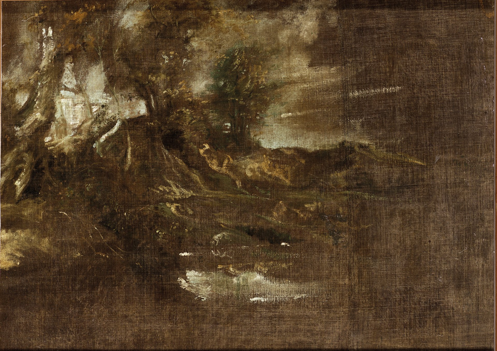 Anthony van Dyck’s painting An Andalusian Horse is impressive in its own right, but research into the work since it was last sold in 2000 revealed the canvas also contains the artist’s only known surviving landscape in oil. When conservators removed a relining from the original canvas, they found a painting of a tree-covered hill sloping down to a lake where a dog is shown having a drink (pictured below). Scholars have pointed out similarities between the scene and the background of a 1620 painting by Van Dyck that is part of the Musée du Louvre collection. On the other side of the canvas, the equestrian painting was a preparation for Van Dyck’s famous portrait of Emperor Charles V (around 1620), now in the Gallerie degli Uffizi in Florence. The two-sided work—which can be displayed either way—once belonged to Thomas Gambier Parry, a British artist whose own significant art collection remains largely intact in the Courtauld Gallery in London. Unlike those works, An Andalusian Horse was passed to an heir after his death, and remained in the family until 2000.