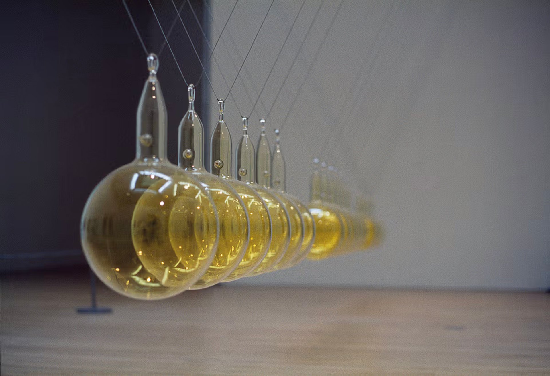 Hamad Butt’s Cradle, part of his Familiars series (1992). The work’s glass baubles are filled with lethal chlorine gas