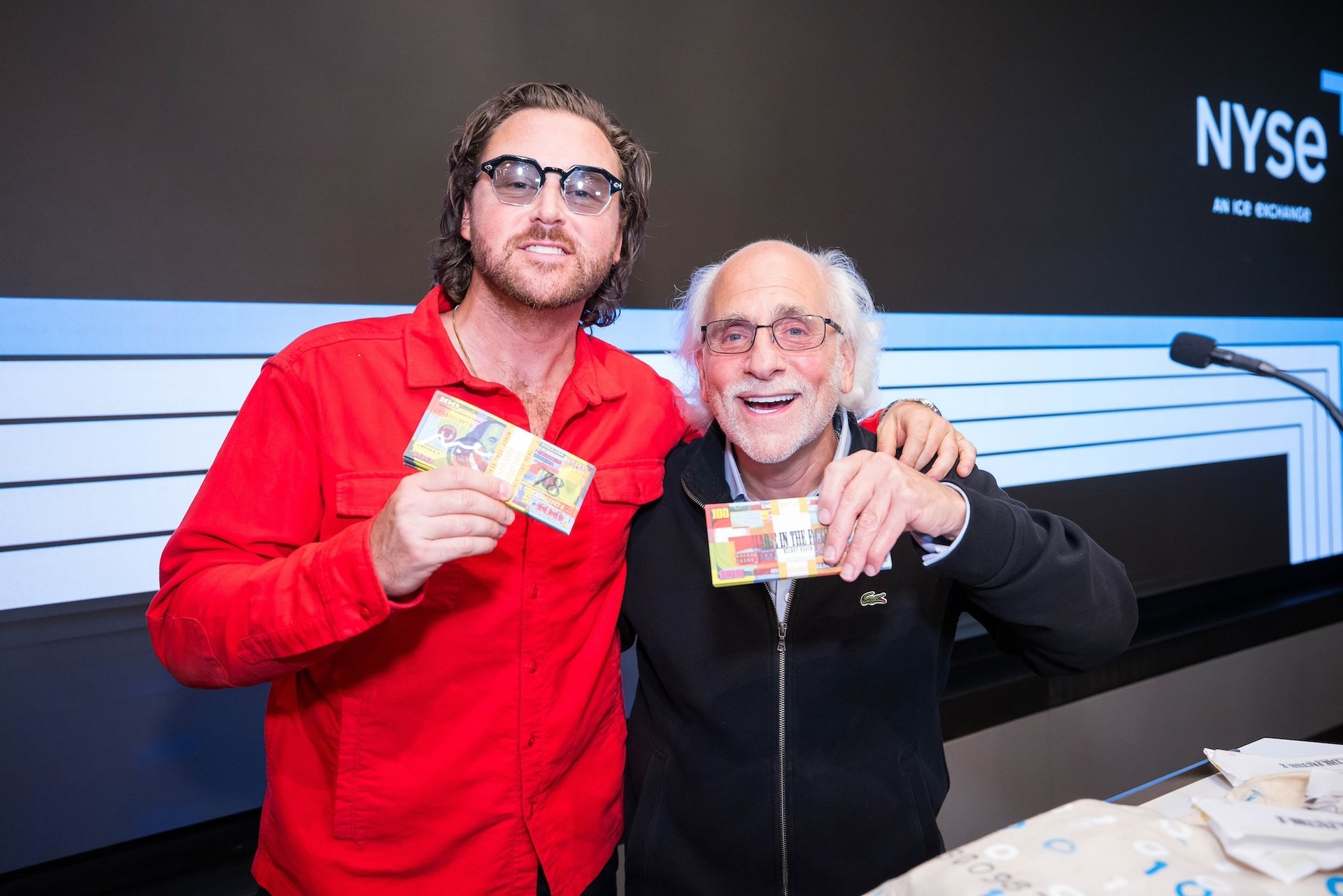 The artist Mister E (left) and Wall Street trader Peter Tuchman (right) during a Big Board Art Hall gallery event in July 2024 Photo Credit: NYSE / NYSE Art Show