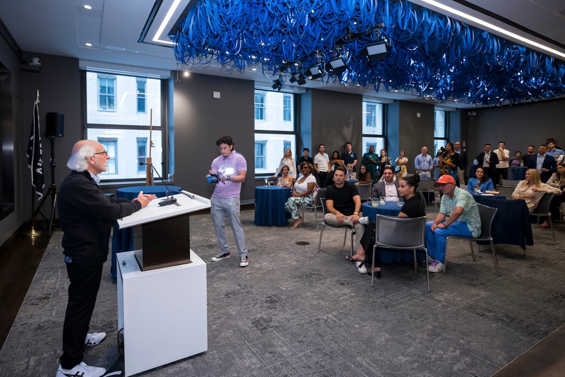 Peter Tuchman speaks to artists and their guests during a Big Board Art Hall gallery event in July 2024 Photo Credit: NYSE / NYSE Art Show