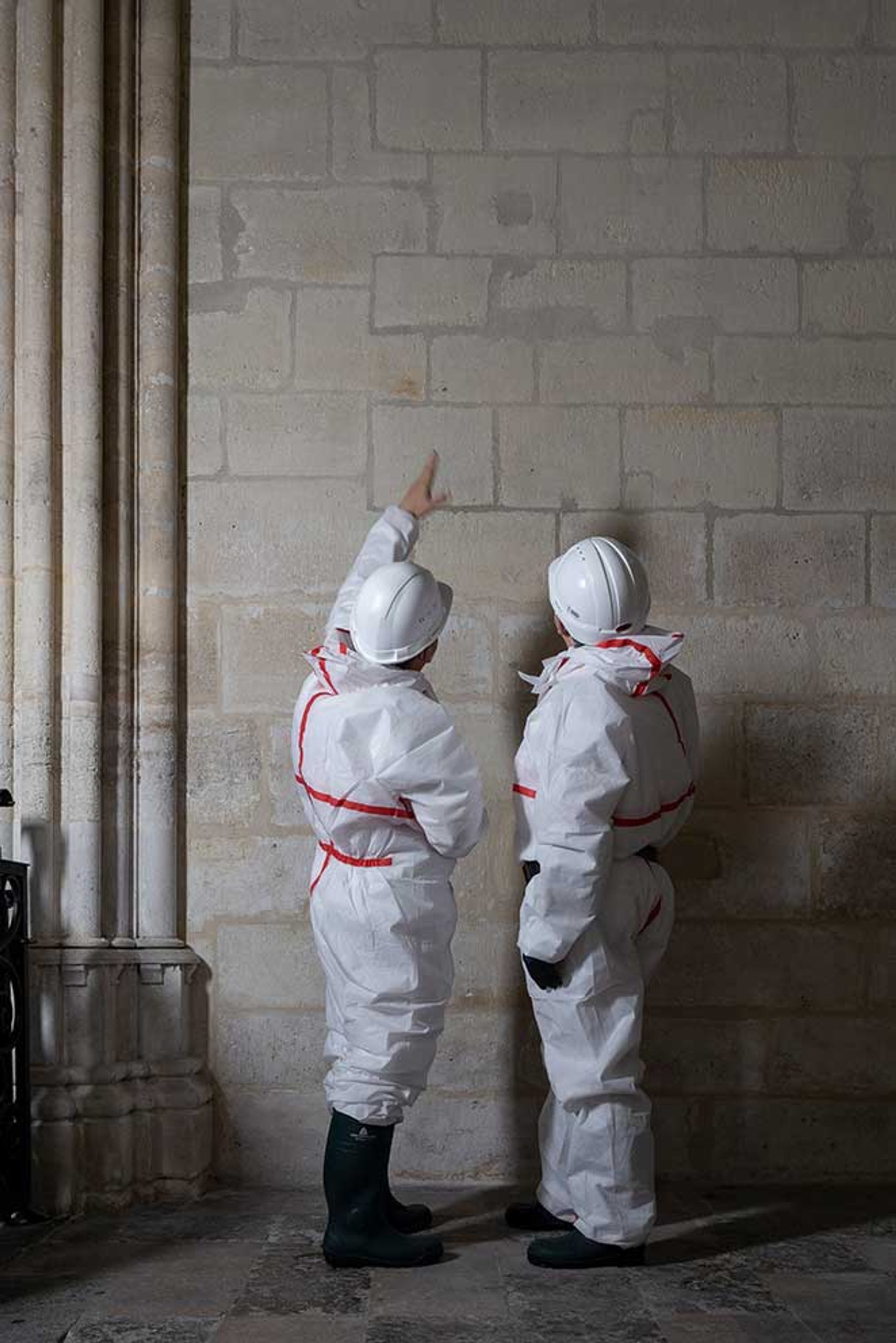 Members of the stone working group examine a wall in the 12th-century Gothic cathedral