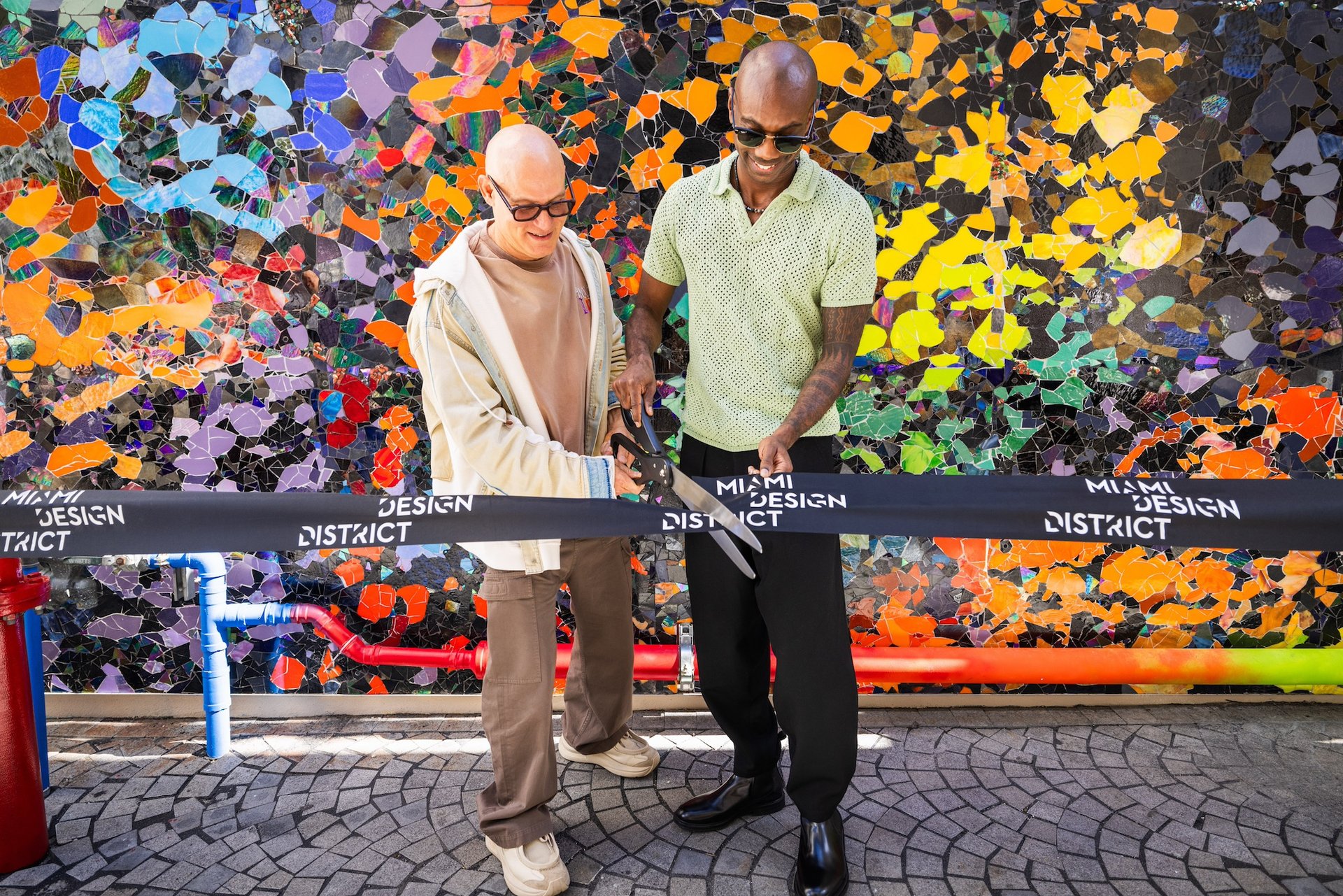 Craig Robins (left) and Alteronce Gumby (right) cutting the ribbon on the latter's new mural in the Miami Design District Photo courtesy Miami Design District
