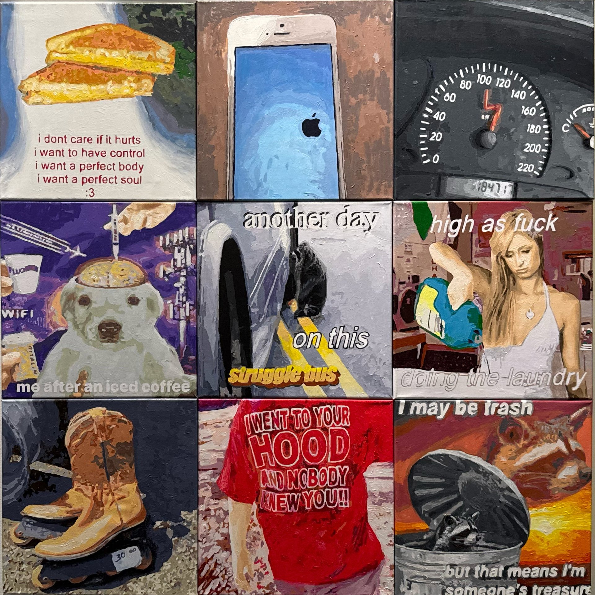 A clever Florida-themed piece made of beads asking observers to “select all images with palm trees” is also making waves. “I thought it would be funny to capture this everchanging and recycled content that gets produced today and forgotten tomorrow,” Ćuk says. “It’s not meant to be a painting—that’s why I painted it.”