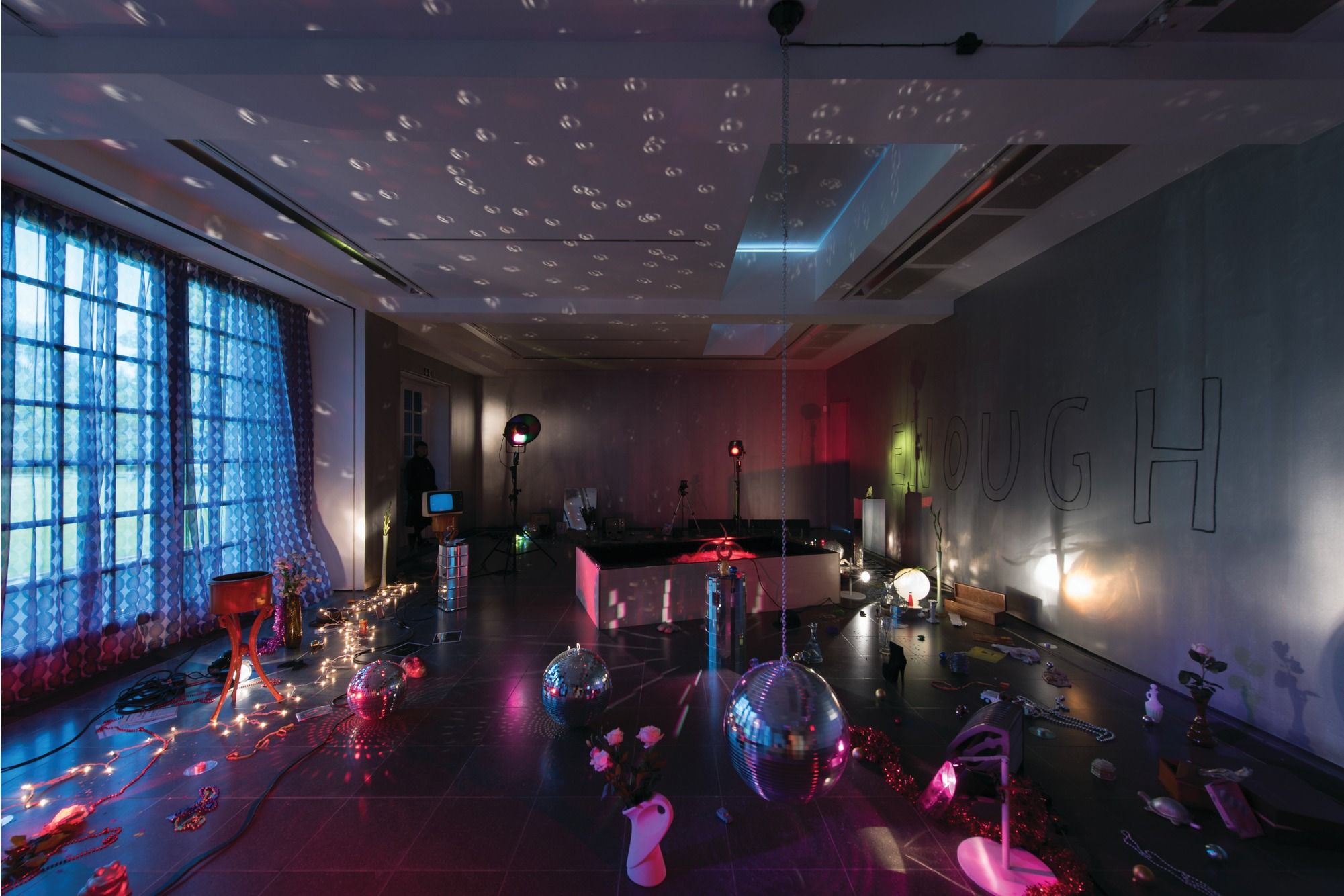 When I curated Chaimowicz’s 2016 Serpentine exhibition An Autumn Lexicon, we restaged its “sister” installation, Enough Tiranny (1972), in the gallery where it had been first presented. This move mirrored Chaimowicz’s tendency to revisit and recontextualise his past work, with a subtle Proustian reference, evoking the passage of time and the way memories shape our understanding of art. Sharing many overlaps with Celebration? Real Life, Enough Tiranny combines art historical references with glam rock popular culture. A silver-painted wall, reminiscent of those in Andy Warhol's Factory, is emblazoned in black lettering with the work’s title containing a deliberate spelling error. This subtle slip was loaded with political significance: the letters “ira” were concealed in the word, referencing the Irish Republican Army (IRA) and the ongoing Troubles in Northern Ireland during that time. Comprising everyday objects such as vases of cut flowers, records and glitter, it is lit by strings of fairy lights strewn on the floor, coloured stage lighting and a hint of daylight filtering through curtains he made—a nod to Felix Gonzales-Torres whose curtain had hung across the same windows in 2000. The disco aesthetic was further enriched with a revolving disco ball, the sound of trickling water from indoor ponds with fish, and a soundtrack. Its scattered nature and open-ended composition invited the audience to wander through the work and experience it as a live space.