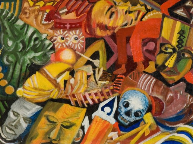 The show includes works by the American Modernist Beauford Delaney and the British contemporary painter Lynette Yiadom-Boakye. Among the 350 objects are works made in the midst of political activism (the Mozambican artist Malangatana Ngwenya’s prison drawings) and others that resonate with what Nascimento, Marcus Garvey, Frantz Fanon and other central thinkers proposed. Among these are Chris Ofili’s Union Black (2003), which replaces the colours of the British flag with the red, green and black of the Pan-African tricolour, and Kerry James Marshall’s wall piece Africa Restored (Cheryl as Cleopatra) (2003), which reconfigures the map of Africa as a charm-filled latex and plywood bas-relief.