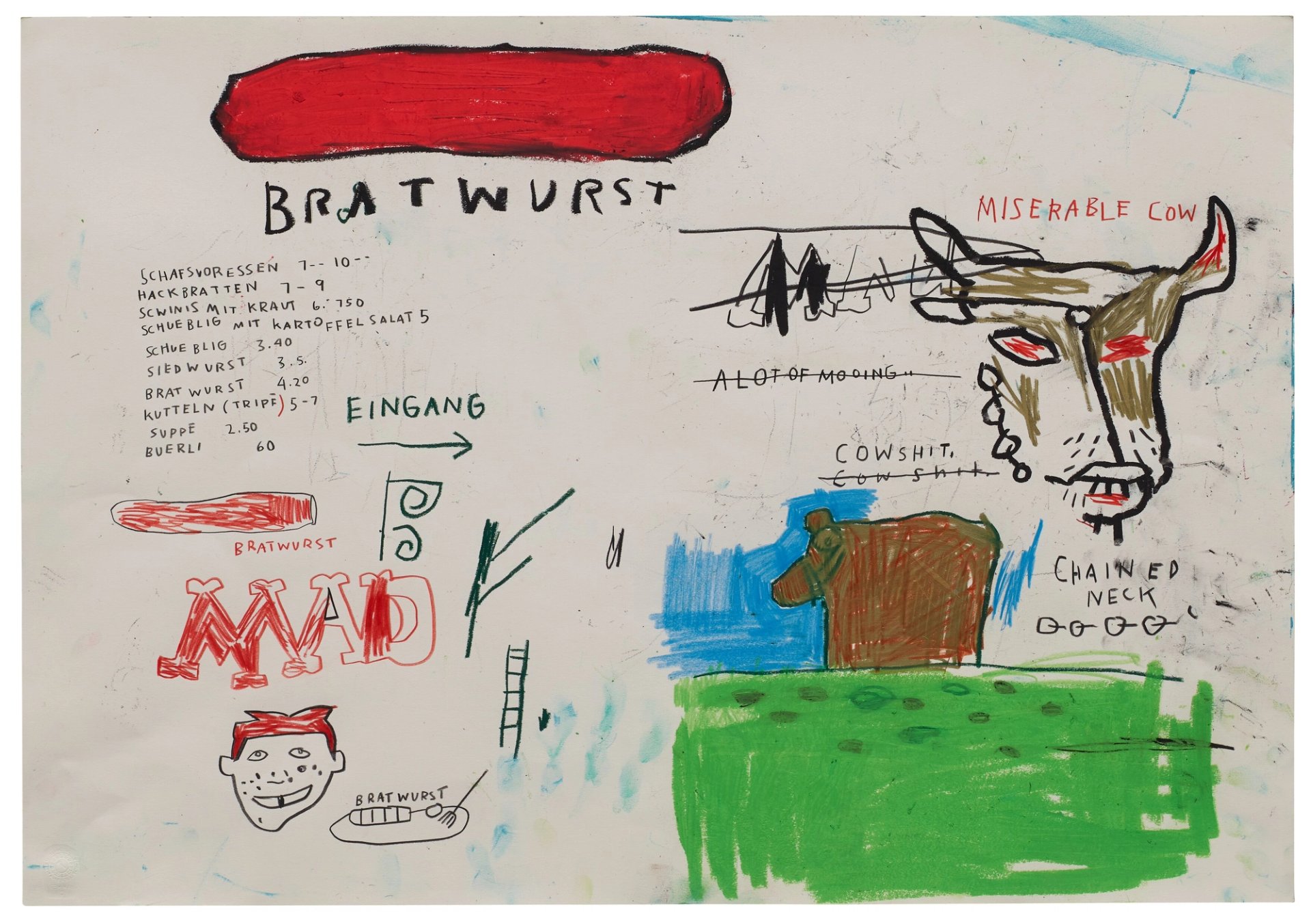 Basquiat became fascinated by the change of pace in the Alps. He went cross-country skiing and visited the Toggenburg Bull Show, where traditionally dressed farmers would proudly display their best bulls. He was fascinated by stag’s antlers and chamois. He ate bratwurst and drank Appenzeller pilsner. Many of these local flavours found their way into Basquiat’s ever-expanding lexicon of icons and pictograms: depictions of phallic red sausages are represented alongside the scrawled word “COWSHIT” in Bull Show Three and Four (both 1983); a loose sketch of a maudlin show bull in a harness emphasises the oppressive bondage of the animal; while Appenzeller Alpenbitter (1983) sees a majestic black bear, the beer’s emblem, on its hind legs while the thinned trees and cottages of the snowy Wildkirchli mountain range stretch out behind.