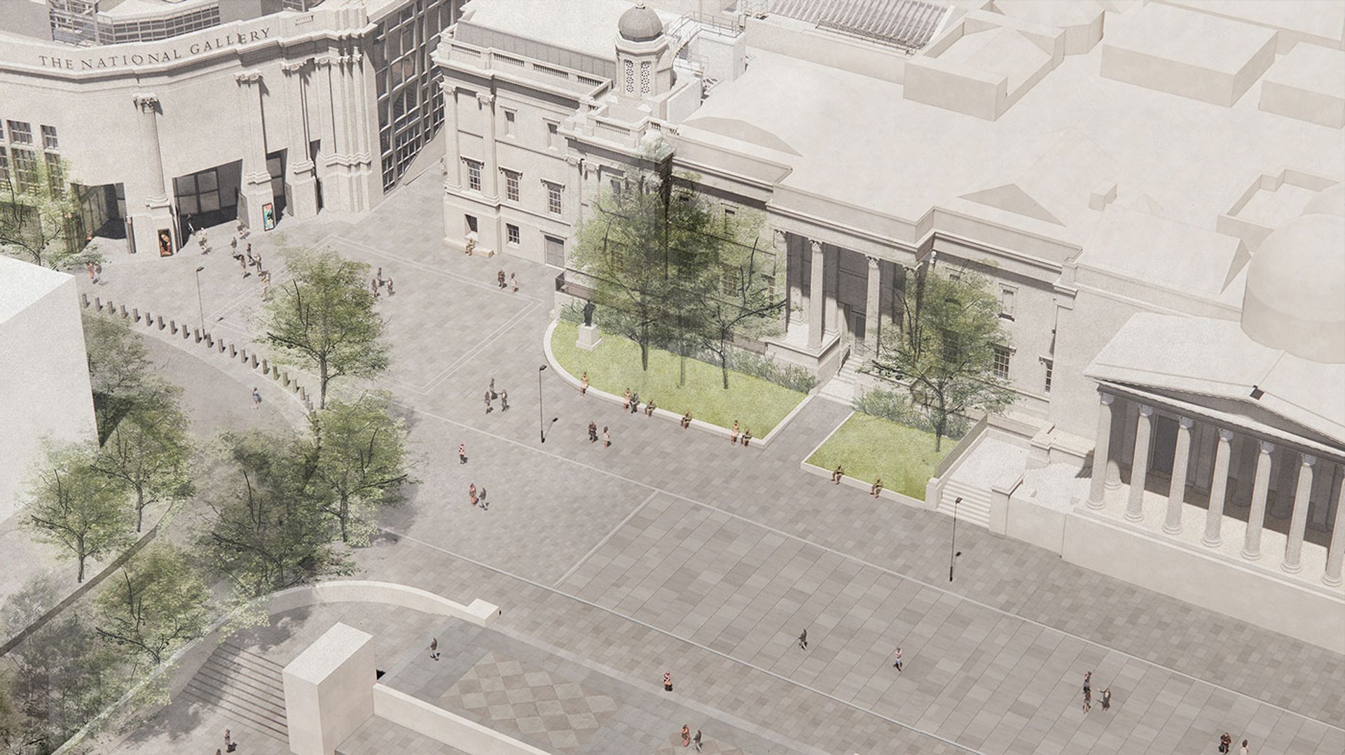 "This is new public realm": Selldorf's rendering of the Sainsbury Wing entrance (left) and the Wilkins building (right), separated by Jubilee Walk. A link from Trafalgar Square to Leicester Square to the north Rendering: Selldorf Architects