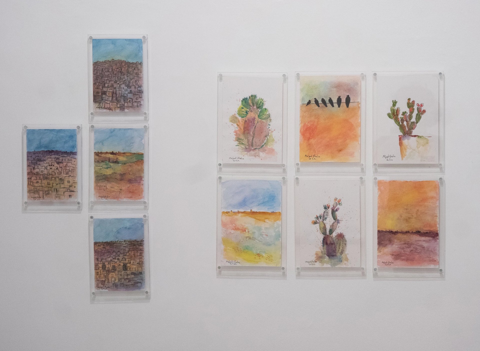 “Majed usually uses acrylics, but now he is just sketching. Basel is using regular paper and some watercolours. Sohail is using children’s notebooks, and Raed is working with any paper and natural colours around him,” he explains. “Every artist in this exhibition is sharing a different story through their work.”