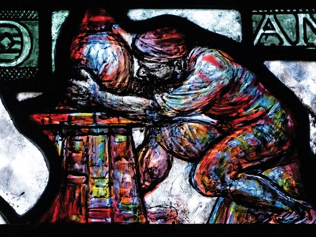 Installed in an historic 15th-century church building founded by Henry VI, which had lost all its glass when bombs fell nearby in December 1940, Hone’s Eton windows wowed artists and critics alike with the power with which she composed in coloured glass on a grand scale. In the process she managed to address, without compromise, the past and present of art, with what felt to many contemporaries like an optimal blend—for that moment and for that imposing gothic space—of the abstract and figurative. She managed in the process to serve both her expressive muse and the contemplative, mysterious nature of the finest religious narrative art. Two other international commissions Hone received in this period are the great rose window (1952) for Farm Street Church, in London’s Mayfair, and a two-light window the following year depicting the Raising of the Daughter of Jairus for the Washington National Cathedral in the US capital.